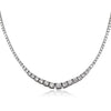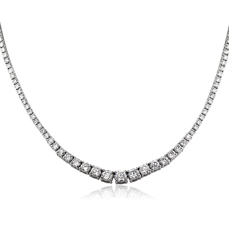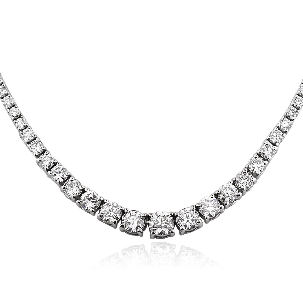 This stunning diamond tennis necklace features round brilliant cut diamonds graduating from about half a carat in the center. The diamonds are set on a 16.5” high polished 18k white gold necklace going half way around the neck. The diamonds are white, eye clean and match perfectly. The brilliance and beauty of this amazing piece is outstanding!