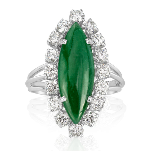 This diamond and jade ring is gorgeous and regal. The elongated jade cabochon set in the center is adorned with a halo of sparkling round brilliant cut diamonds that help to enhance the royal deep green of the jade. The 1.00ct diamond halo features F-G colored, VS1-VS2 clarity diamonds. This piece is not only beautiful but also rare. It is an estate piece that dates back circa 1969 and it has the original engraving inside. Set on a high polish 18k white gold split shank setting, this piece of artwork is unique and extraordinarily elegant.