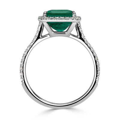 Dare to be different with this incredible emerald cut emerald engagement ring! This design showcases a stunning 2.83ct emerald cut emerald that displays a beautiful deep green hue. Adorned by a shimmering halo of round brilliant cut diamonds, this centerstone truly speaks for itself with it's desirable, vivid green coloration. The basket connects into a dainty tapered shank that is also studded with diamonds for additional sparkle. This emerald cut emerald ring is the ultimate definition of glamorous sophistication!