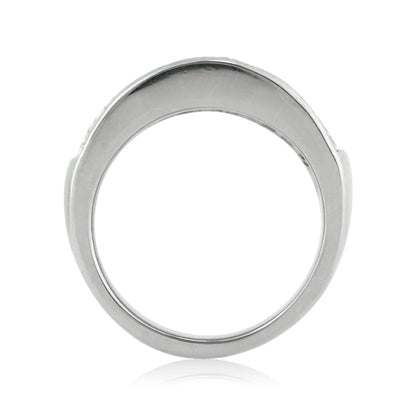 For some wild sparkle factor, look no further! There are 5.00ct of incredibly brilliant princess cut diamonds invisible set on this 18k white gold right-hand ring. The wide band looks stunning on and make a huge statement on the hand.