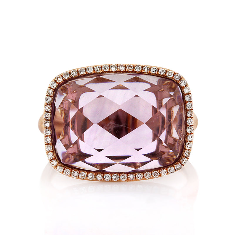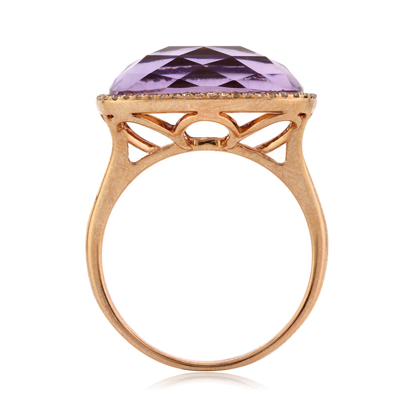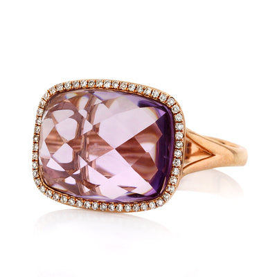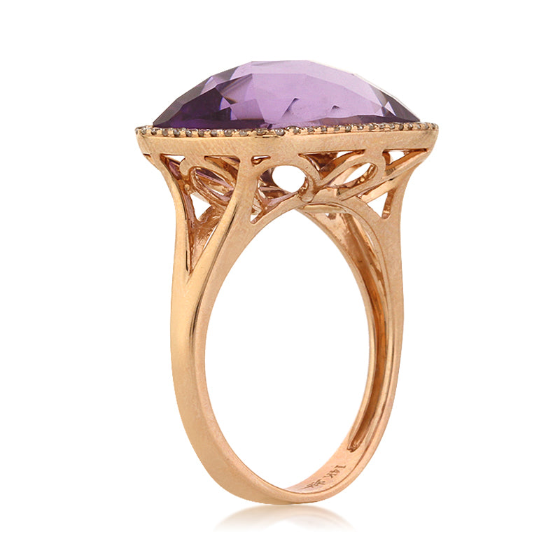 The look of this gorgeous rose cut cushion amethyst right-hand ring is astonishing. The 14k rose gold ring features a clear purple amethyst surrounded by a halo of round cut diamonds. This is a very elegant cocktail ring that will become a cherished piece of jewelry.
