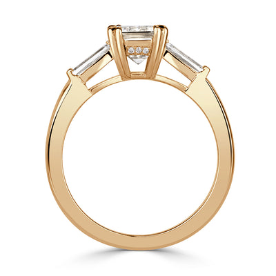 This three-stone emerald cut diamond engagement ring offers amazing finger coverage and is a classic look! The beautiful 1.88ct emerald cut center diamond is GIA certified at J-VVS2. It is exceptionally white, has a mesmerizing cut and is nearly flawless in clarity. This beauty measures at an incredible proportion of 8.16 x 5.99 mm. It is accented by a tapered baguette cut diamond on either side with a dainty hidden halo detail on the basket bar for extra sparkle. Handcrafted in our signature 18k champagne yellow gold setting, this emerald cut diamond engagement ring is stunning from every angle!