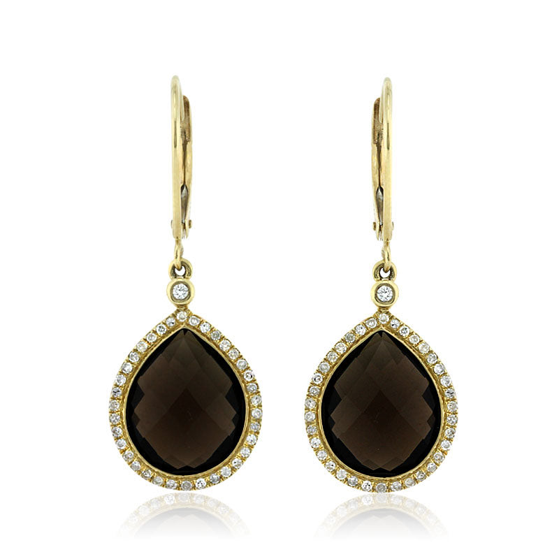 Smoky quartz and yellow gold pair incredibly well in this pair of dangle earrings. The rose cut pear shaped smoky quartz center stones are accented by round cut diamond halos making for a wonderful, sparkly contrast.