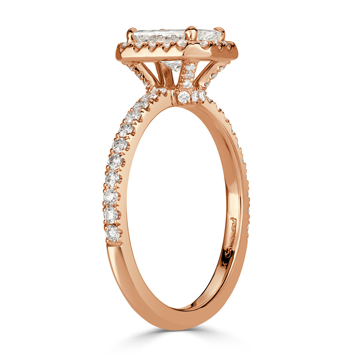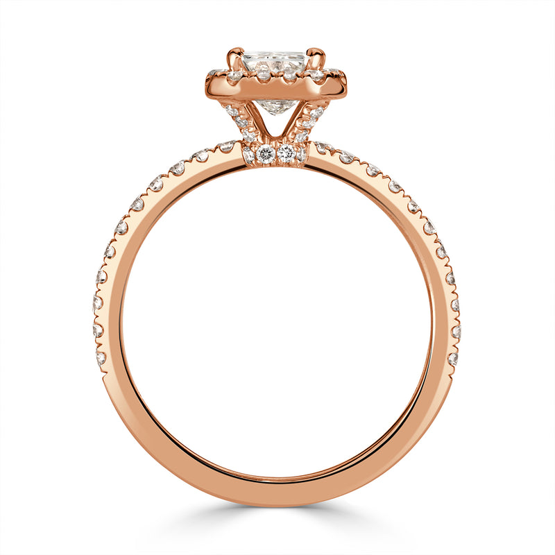 If she is desiring fiery sparkle, this incredible radiant cut diamond engagement ring is the perfect one for her. This design features a spectacular 1.00ct radiant cut center diamond that is GIA certified at G-VS2. This gorgeous gem is beautifully white and super clear. It measures at 6.91 x 5.08mm and displays beautiful finger coverage especially with it's halo detail. The shimmering halo is a delicate touch and additional round brilliant cut diamonds are accented up the basket connectors and down both sides of the shank. This stunning 18k rose gold diamond engagement ring is sure to sparkle from miles away!