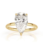 This stunning pear shaped diamond solitaire engagement ring is such an outstanding value! The lovely 2.30ct pear shaped center diamond is GIA certified at J-VVS2. It is exceptionally white, has a crisp cut and faces up like a 3ct+ diamond due to it's amazing proportion of 12.87 x 7.49mm. It is handcrafted in our signature 18k champagne yellow gold. For additional sparkle, there are accents of round brilliant cut diamonds on the hidden halo design. This luxurious pear shaped diamond engagement ring is spellbinding from every angle!