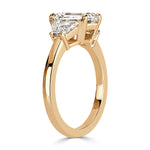 Truly one of our favorite designs, this spectacular three-stone diamond engagement ring was handcrafted with perfection in mind. The center stone features a 2.01ct emerald cut diamond GIA certified J-VVS2. The clarity is nearly flawless and the diamond shines through like a crystal clear mirror! This white of the diamonds vividly pop against the gorgeous, warm hue of the 18k champagne yellow gold setting. The center stone measures very large for its weight at 8.95 x 6.02mm; and is accentuated by two side trapezoid cut diamonds for a luxurious clean-cut look. This stunning emerald cut diamond ring offers tremendous finger coverage and is sure to win her heart over!