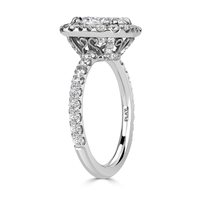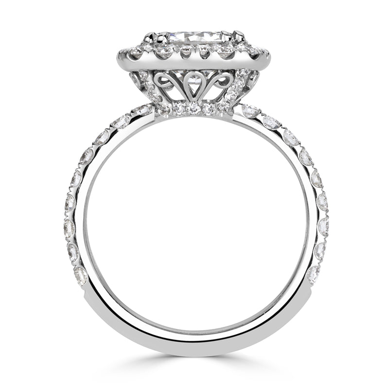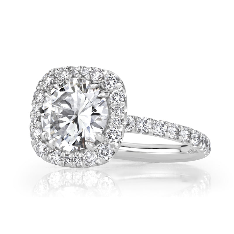 This exceptionally beautiful and spectacularly brilliant round diamond engagement ring is mesmerizing! It all starts with the gorgeous and rare 1.91ct round brilliant cut diamond set in the center. It is GIA certified at F-SI1, exceptionally white and perfectly clear! The inclusion is a white feather to the side of the diamond which is hardly visible under 10X magnification, giving you a VS clarity look at a great savings. The center diamond measures at 8.36-8.41mm, giving the look of a two carat plus diamond without the added cost. This piece screams value! The custom-made platinum setting features a cushion shape halo around the round diamond in the center. The combination is breath taking! The shank is set with round diamonds in a micropave setting as well. The center basket features handmade filigree detail with round diamonds studded on the connectors. This piece will astonish you. You won't be able to stop looking at it! Stunning in every way, you will cherish it forever!