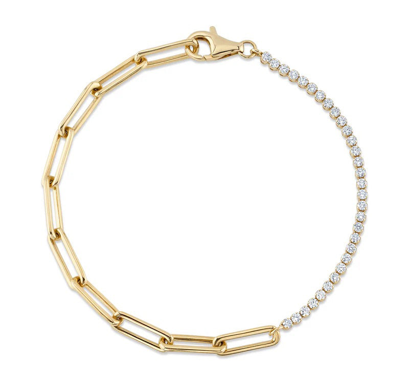 Elevate your style with our 0.66ct Round Brilliant Cut Diamond Tennis and Paper Clip Bracelet. This unique design fuses classic tennis bracelet elegance with modern paper clip links, showcasing a stunning selection of diamonds totaling 0.66 carats. Each diamond sparkles brilliantly, enhancing the gold backdrop. Perfect for any occasion, this bracelet blends sophistication with contemporary flair, making it a standout piece in any jewelry collection.