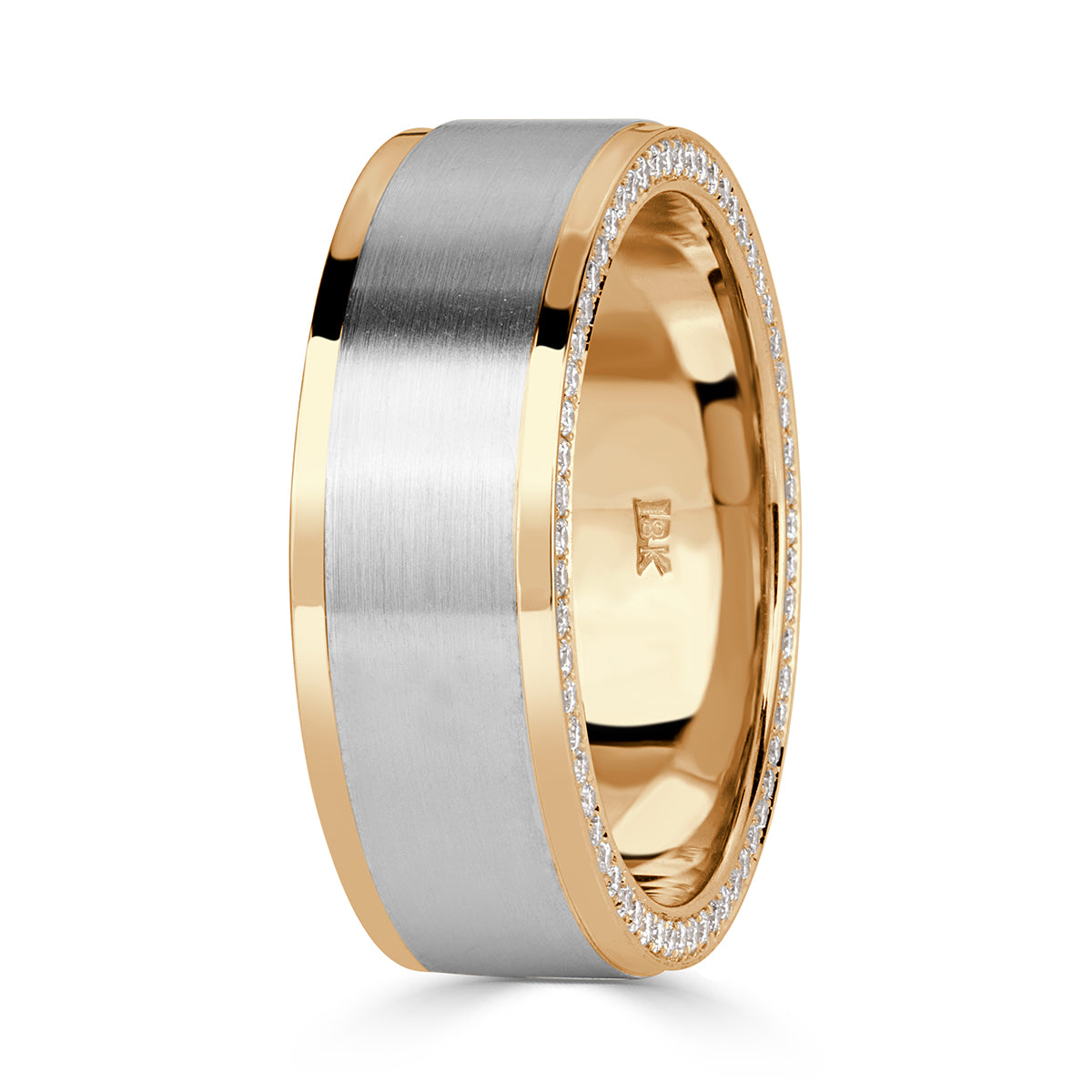 This stunning two-toned mens band is truly luxe and a one of a kind piece! A subtle 18k white gold center is designed with a matte finish with high polish 18k yellow gold borders on either side. From the side views, a single row of sparkling round brilliant cut diamonds border both edges of the band totaling 0.65ct. The brilliant white color of the diamonds truly pop against this subtle tones of this design. Shown in an 8mm width, this mens band displays substantial finger coverage.