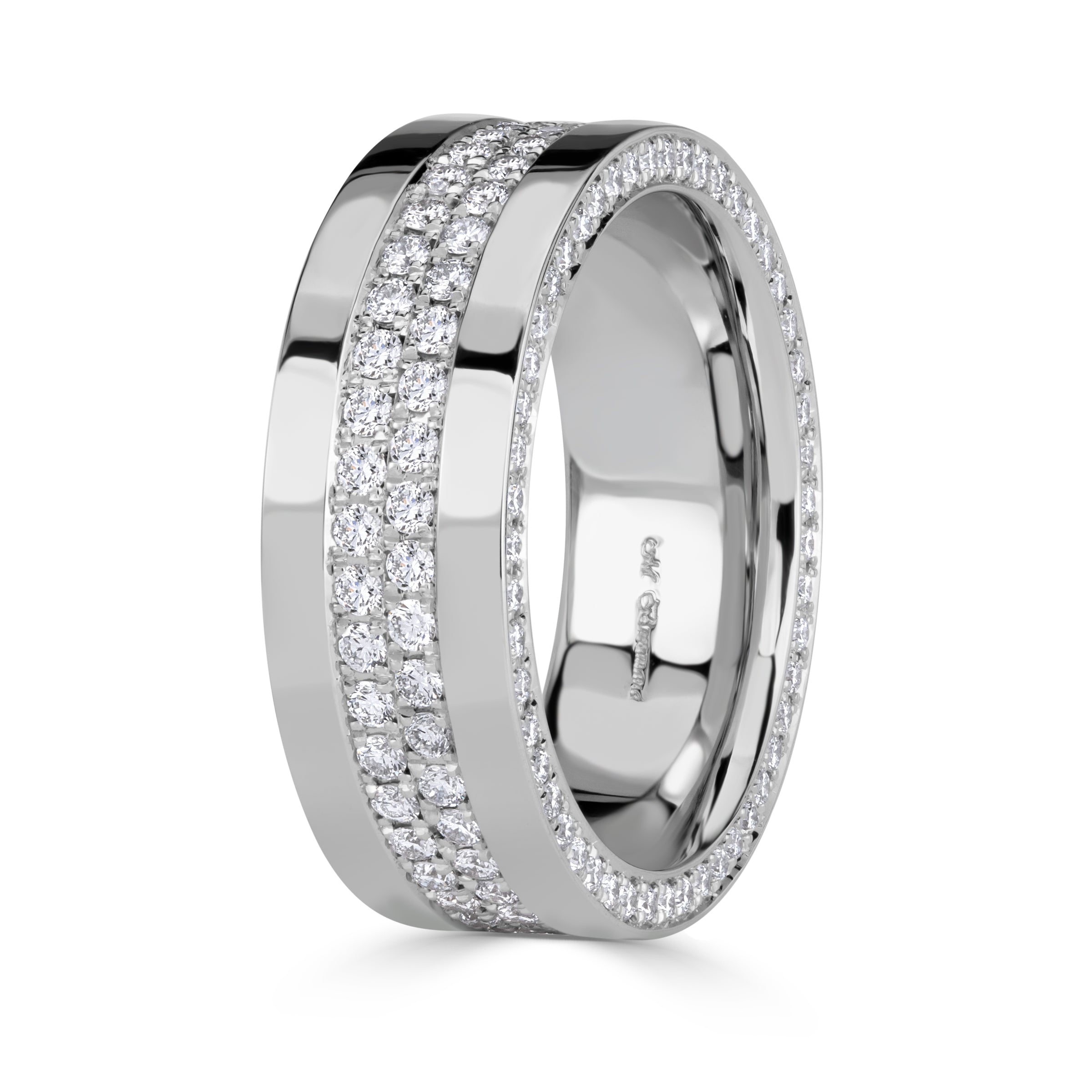 The 1.90ct Round Brilliant Cut Diamond Men’s Wedding Band is a statement piece of timeless elegance and masculine sophistication. Featuring a striking 1.90 carats of meticulously selected round brilliant cut diamonds, this men's diamond wedding band offers exceptional fire and brilliance thanks to its premium E-F color and VS1-VS2 clarity grades. The round brilliant cut diamonds on this men's wedding band are expertly flush-set to provide a sleek, low-profile look that balances high sparkle with everyday practicality.