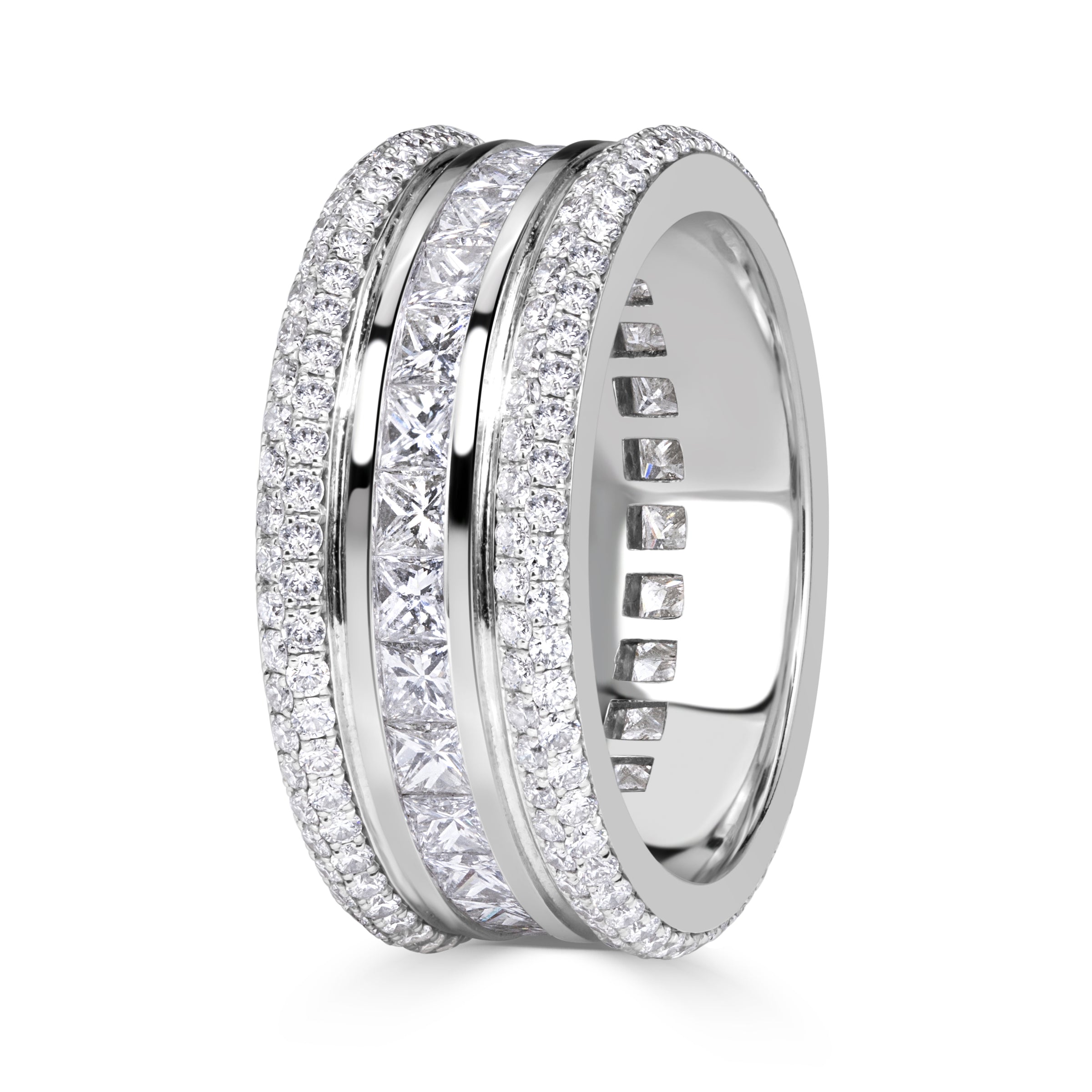 This exceptional men's diamond wedding band is a powerful combination of princess cut diamonds and round brilliant cut diamonds, totaling 4.69 carats of dazzling brilliance. Hand-selected for superior G-H color and VS1-VS2 clarity, these diamonds are precisely channel-set for a smooth, uninterrupted finish that maximizes both comfort and shine. The interplay between the geometric edge of the princess cut diamonds and the timeless sparkle of round brilliant cut diamonds creates a unique, multidimensional look that’s bold yet refined.