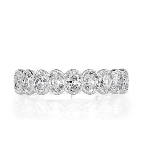 Seal the cherished moment of marriage vows with this lovely 18k white gold diamond wedding band. Mark Broumand never compromises when it comes to diamond selection and each of the diamonds in this band consist of premium qualities. The oval cut diamonds display shimmering brilliance due to their premium colors of E-F and VVS2-VS1 clarities. Each stone is adorned with a dainty milgrain etching around it, which truly allows the diamonds to pop. This piece of artwork is a unique and beautiful take on a wedding band.