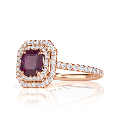 Our captivating 1.62ct emerald cut ruby and diamond engagement ring in 18K Rose Gold showcases a mesmerizing double halo framing the passion-red ruby center stone. The focal point of this ring is a stunning 0.92ct GIA-certified ruby, measuring 6.03x5.96mm, exuding rich color and allure. The double halo is adorned with a total of 0.70ct E-F color & VS1-VS2 clarity diamonds, enhancing the brilliance and elegance of the design. Make a statement with this exquisite ring that combines the vibrant beauty of ruby with the timeless sparkle of diamonds, perfect for a truly special occasion.