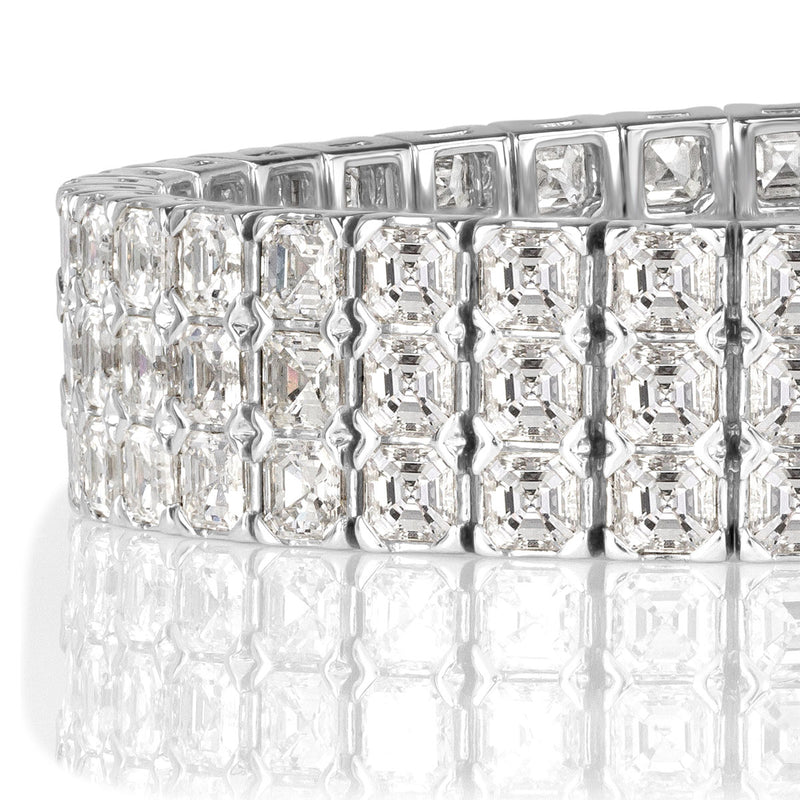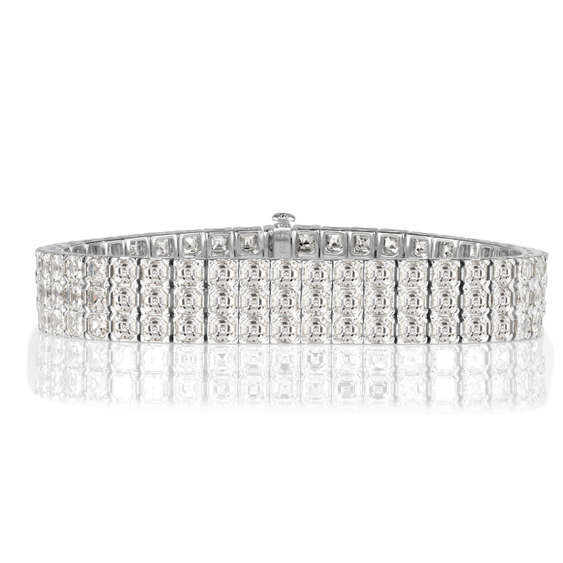 This 18k white gold bracelet was crafted with the upmost glamorous woman in mind. It showcases 21.72ct of dazzling asscher cut diamonds that are styled going across the wrist in 3 rows for incredible presence! The diamonds are of premium qualities of top E-F colors, VVS2-VS1 clarities. This substantial diamond bracelet is perfect worn alone as the ultimate statement piece!