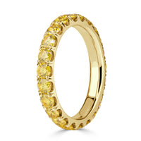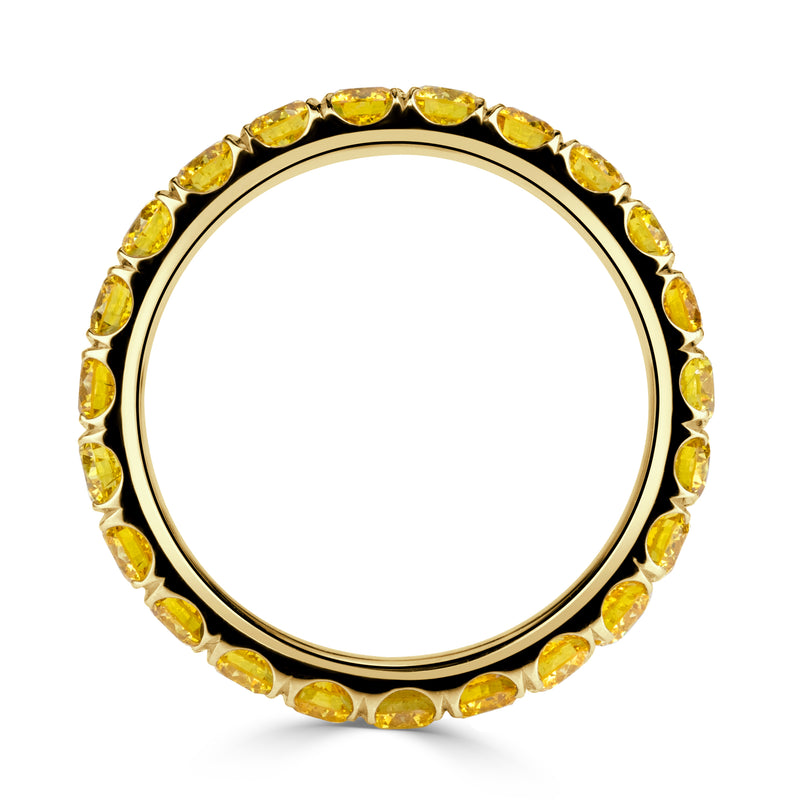 This 1.80 carat Round Brilliant Cut Fancy Intense Yellow Diamond Eternity Band features a continuous line of perfectly matched yellow lab diamonds, offering even color and balanced brilliance around the entire band.