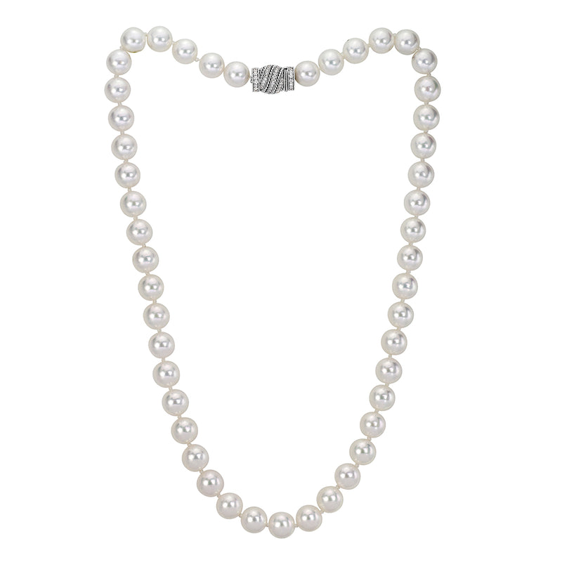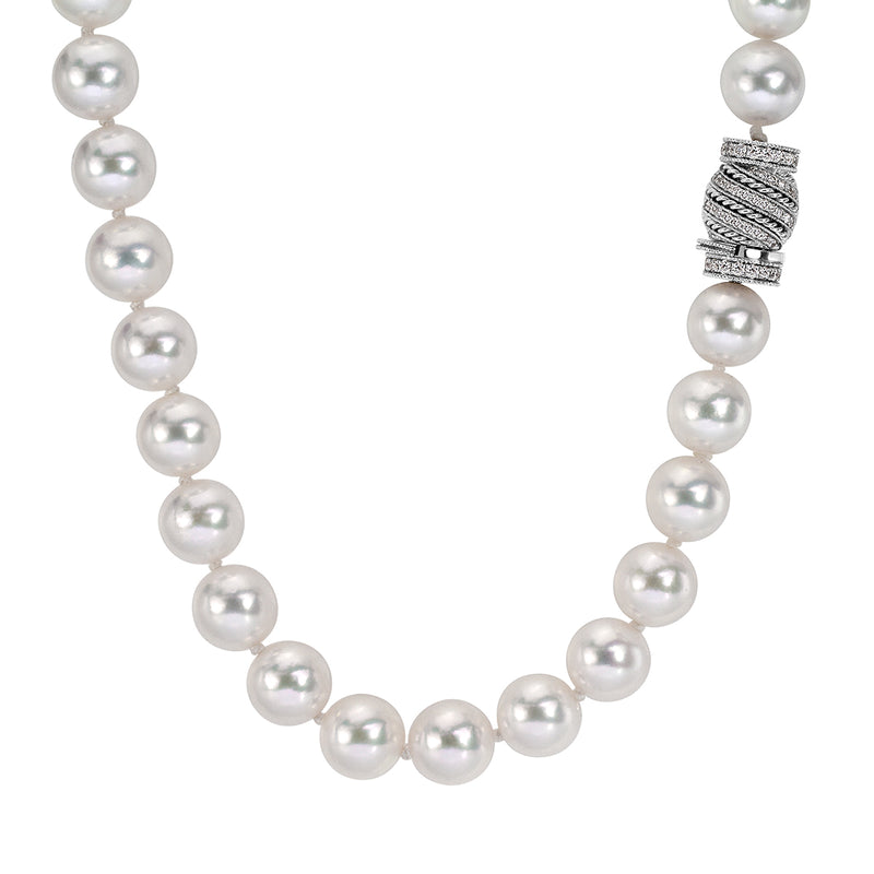 This Akoya Pearl and Diamond necklace is pure magic! The 18k white gold clasp features 0.72ct of diamonds for a little pop of sparkle. At an 18 inch length with pearls ~ 8.5mm in size, this necklace is sure to impress. For a classic and elegant look, this pearl necklace is the way to go!