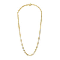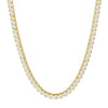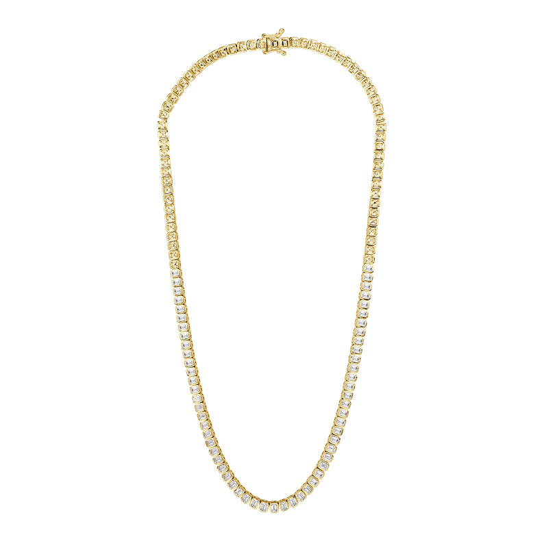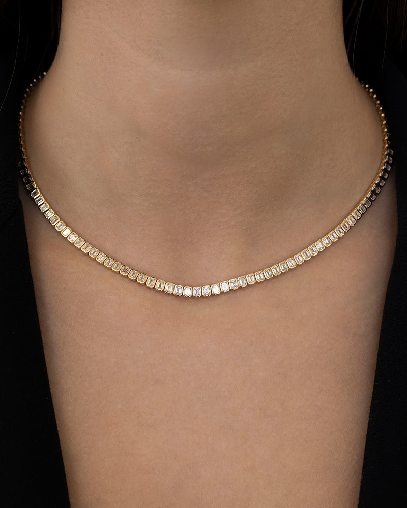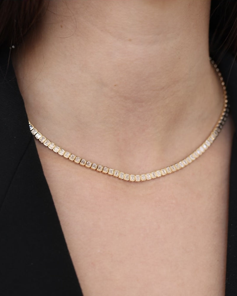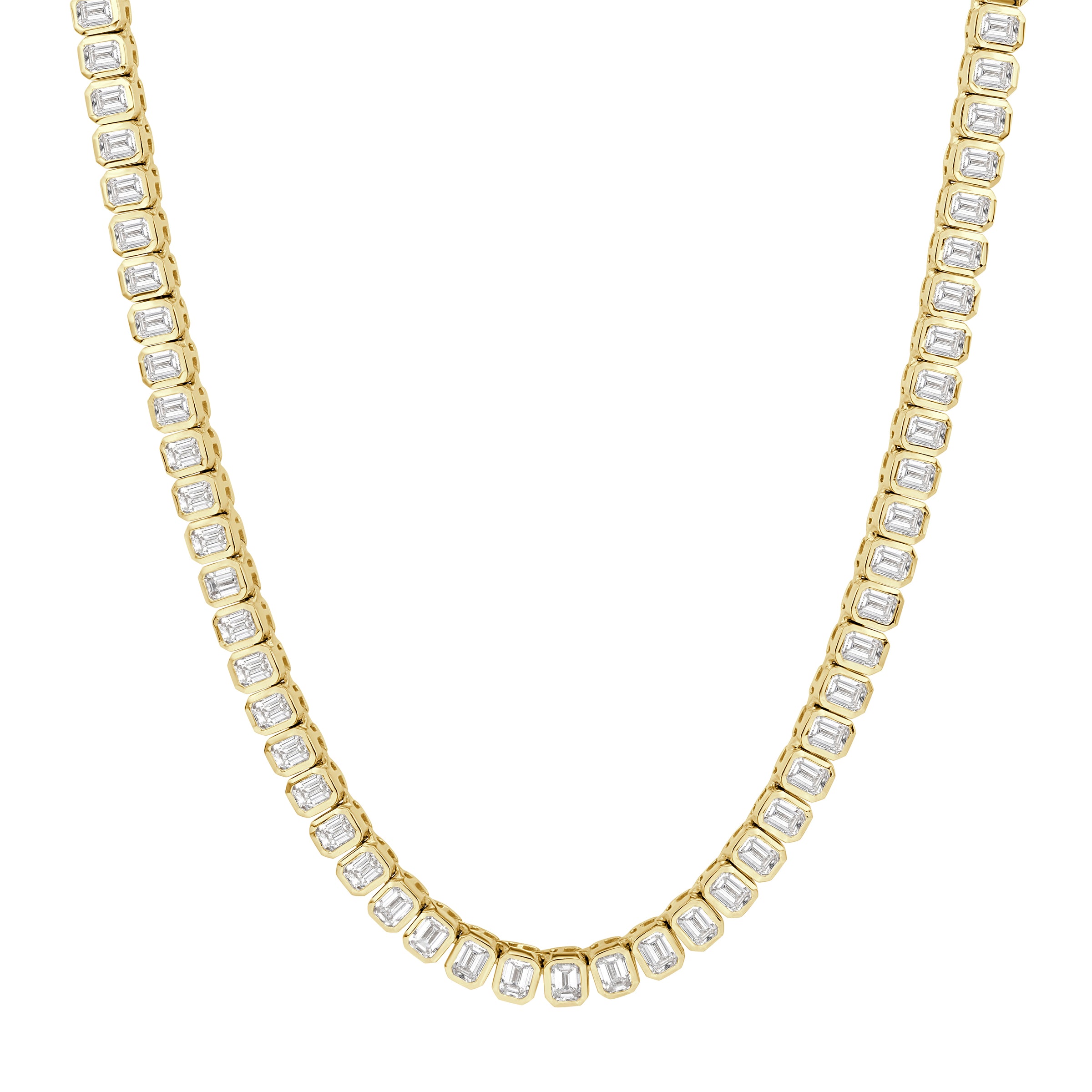 The 5.66-carat Emerald Cut Diamond Bezel-Set Tennis Necklace delivers luminous presence in a modern, architectural form. Crafted in 14K yellow or white gold, this necklace features emerald cut diamonds graded G-H in color and VS1-VS2 in clarity, each framed in a bezel setting that enhances security, smoothness, and luminous continuity.