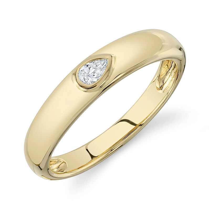 This 0.08ct Pear Shaped Bezel Diamond Band in 14k gold radiates a sophisticated charm, ideal for those who appreciate minimalist yet refined jewelry. The bezel-set pear-shaped diamond provides a subtle, elegant sparkle, perfectly complemented by the warm glow of 14k gold. Designed for effortless stacking or as a standalone piece, this ring adds a touch of modern luxury to any collection. Its clean, contemporary lines and timeless appeal make it a versatile piece that transitions seamlessly from everyday wear to special occasions. This band is a stunning example of understated elegance, perfect for discerning jewelry enthusiasts.