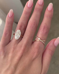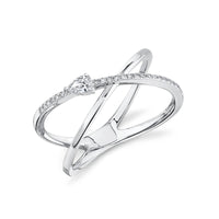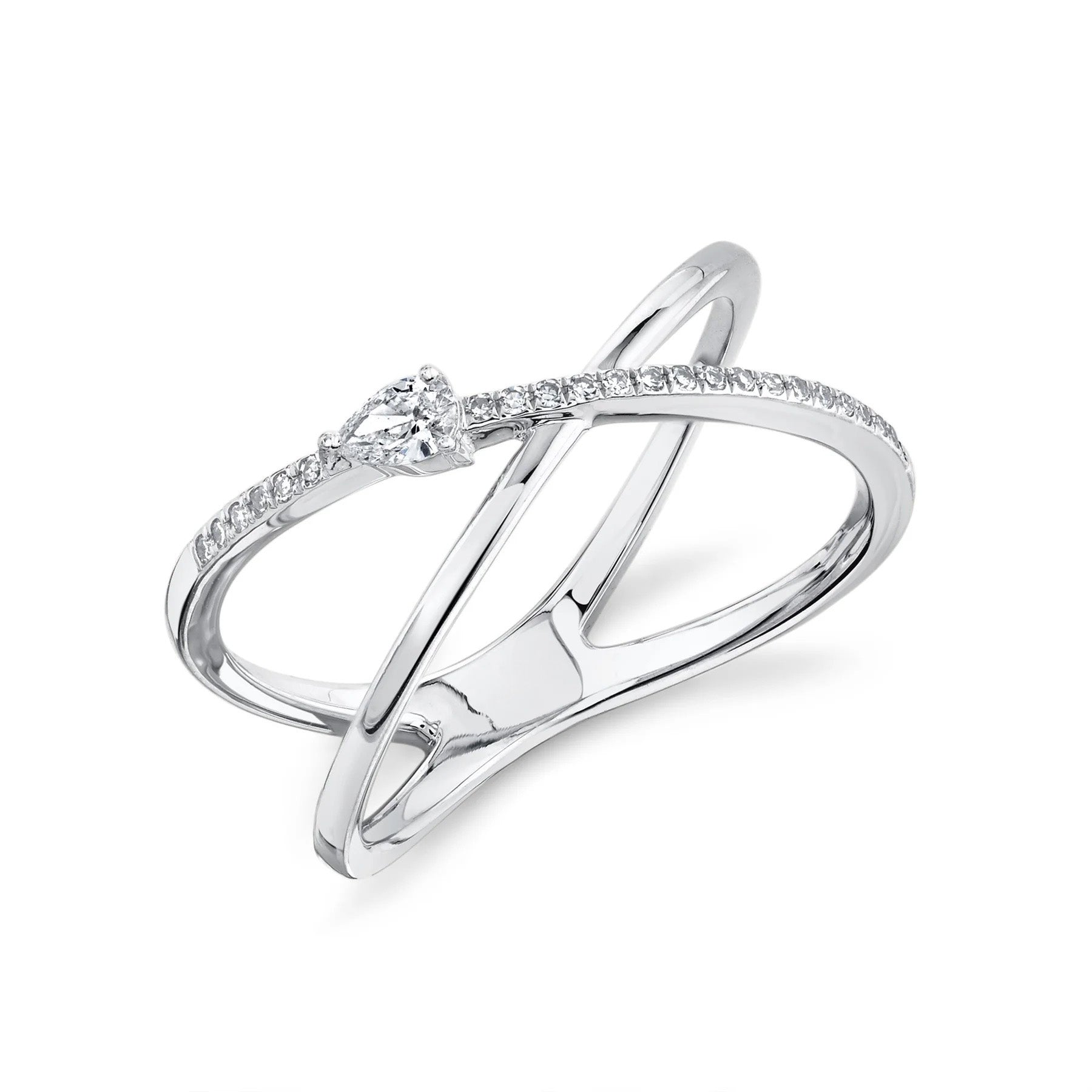 The criss-cross band creates an open, modern silhouette that feels both delicate and eye-catching. The pear shaped diamond draws the eye with its elongated form, while the round brilliants enhance the ring with balanced shimmer. Together, they form a design that is refined yet bold, perfect for wearing alone or stacking with other bands.