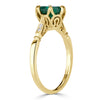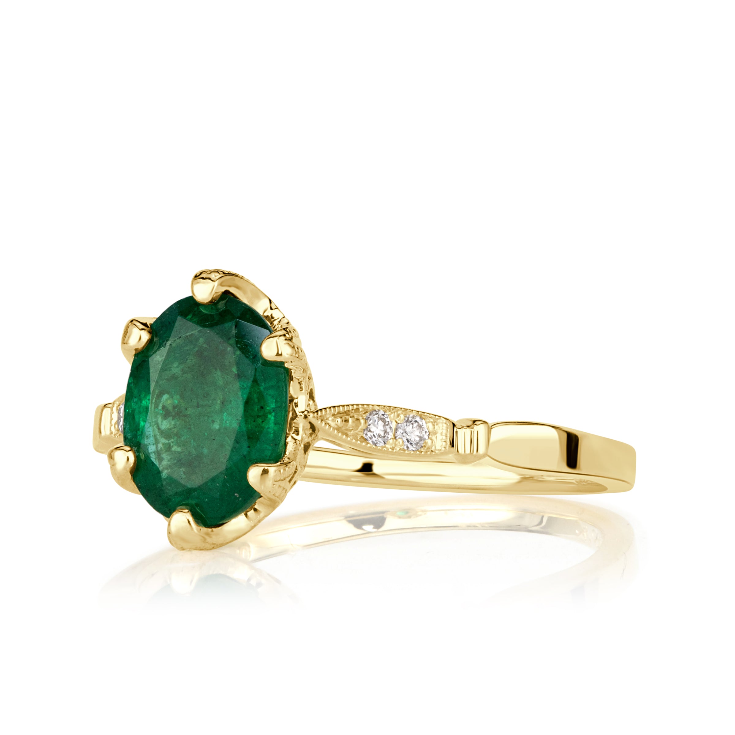 Unique 6-prong design, attractive stone color, and incomparable metal quality - this engagement ring is stunning. The green, GIA-certified 1.24ct oval cut Emerald, featured in the center, has an impressive size of 8.14x6.15mm and is so beautiful that you won't be able to take your eyes off of it. The ring is handcrafted in a classic tapered cathedral mounting design in a high polish 18K Yellow Gold setting with sparkling 0.04ct round brilliant cut side diamonds, accenting the shine of the gold. This oval cut emerald engagement ring is the epitome of glamour and elegance!