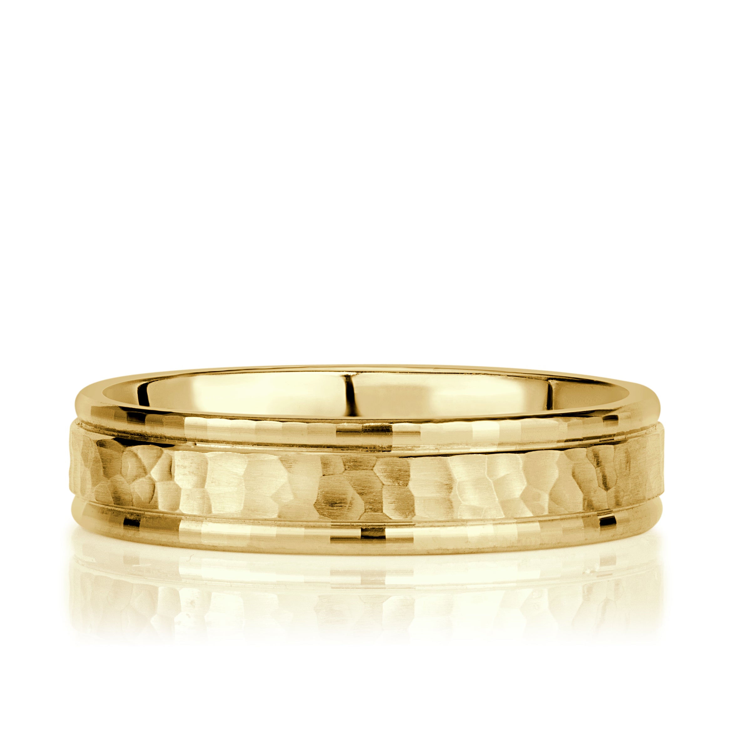Its centerpiece features a hammered finish that reflects light with understated texture. This artisanal detail is framed by faceted step edges, lending both contrast and refinement to the ring. The result is a band that feels substantial yet uncluttered—a contemporary interpretation of a classic men’s wedding ring.