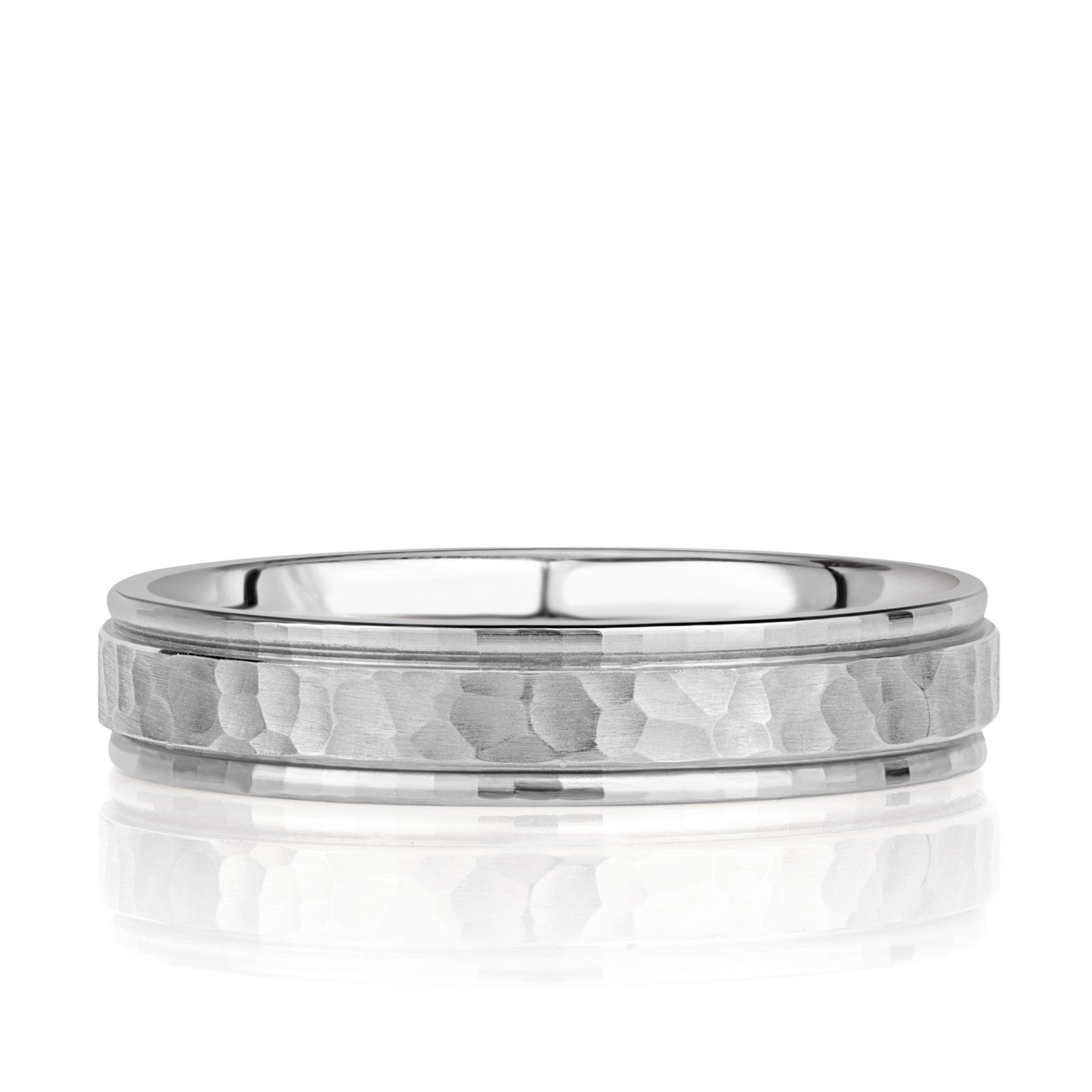 The ring’s center boasts a handcrafted hammered finish, inviting light to dance across its subtle planes. This textured center is framed by softly defined faceted step edges, giving a reflective glow that enhances contrast while honoring minimalist aesthetics. The result is a band that feels purposeful rather than ostentatious.