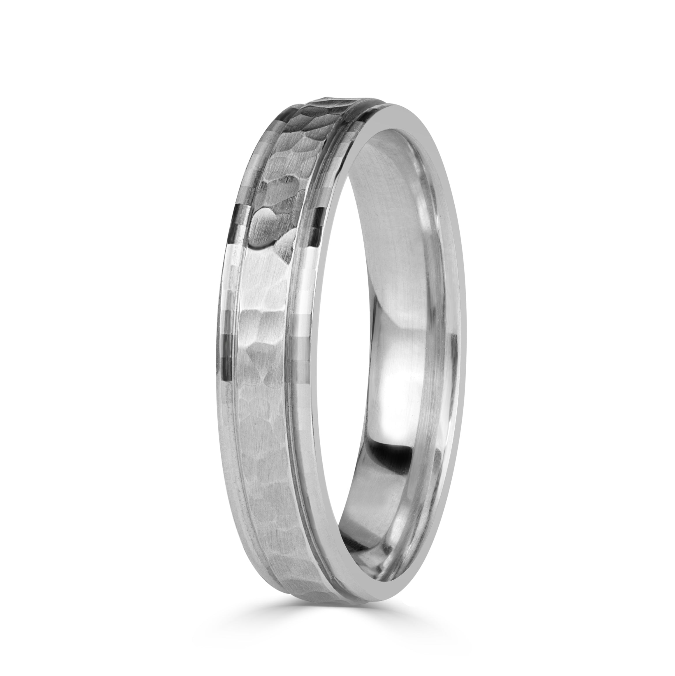 The Hammered Center Faceted Men’s Wedding Band captures quiet refinement through thoughtful design. Its 4mm width delivers presence without excess—a modern statement of calm sophistication.