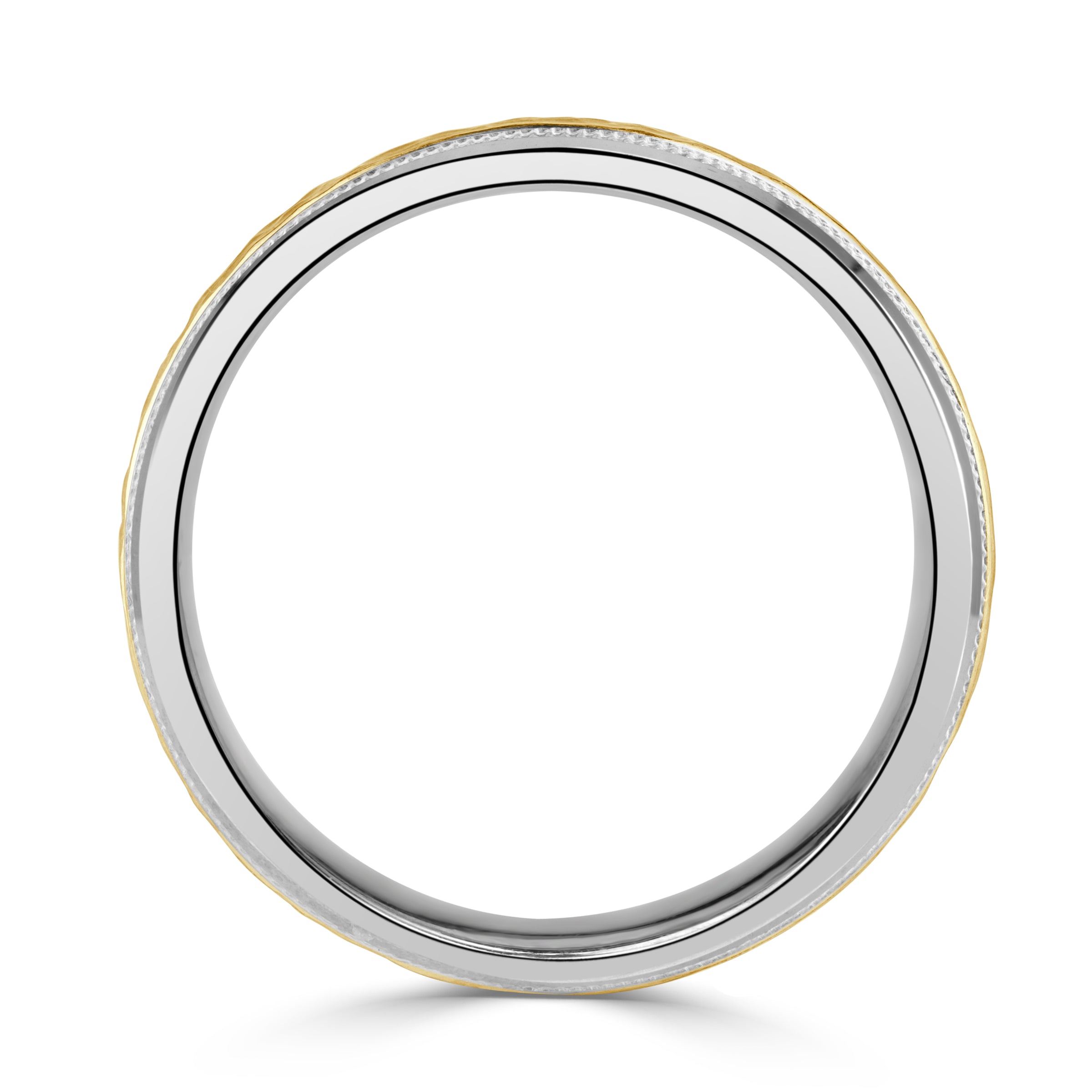 The Hammered Finish Beveled Milgrain Edge Men's Wedding Band combines rugged detail with architectural poise and crafted for the modern groom who values texture and tradition. The hammered finish creates a unique, tactile surface that scatters light across its textured field, evoking both strength and understated sophistication. The finely etched milgrain grooves introduce vintage-inspired detailing, offering depth and dimension that reward a closer look.