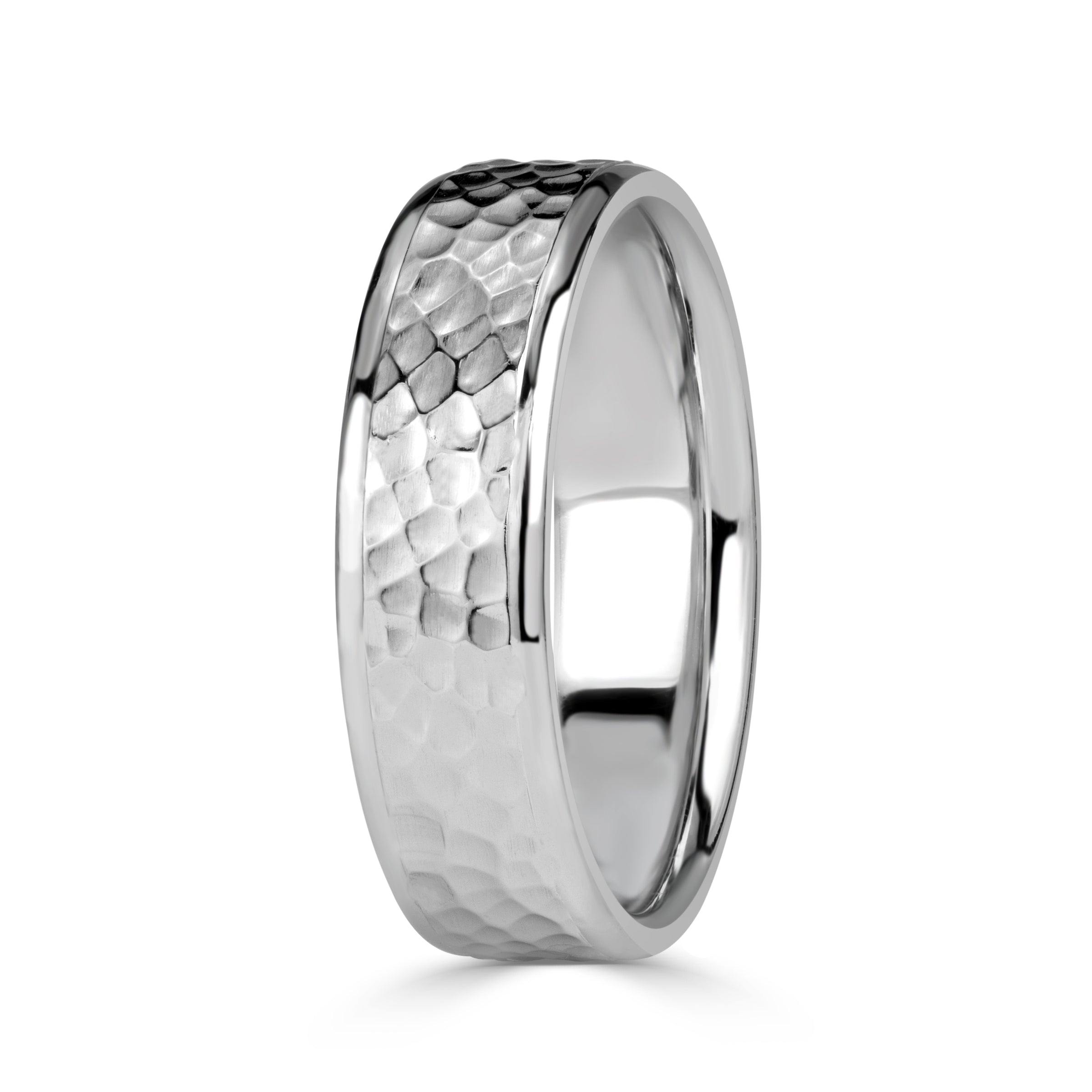 A study in contrast and craftsmanship, this 6.5 mm men’s wedding band blends bold texture with sleek geometry. The hammered center catches and scatters light across each facet, producing a natural play of brilliance, while the polished step edges frame the design with clean, architectural precision.