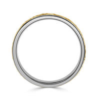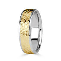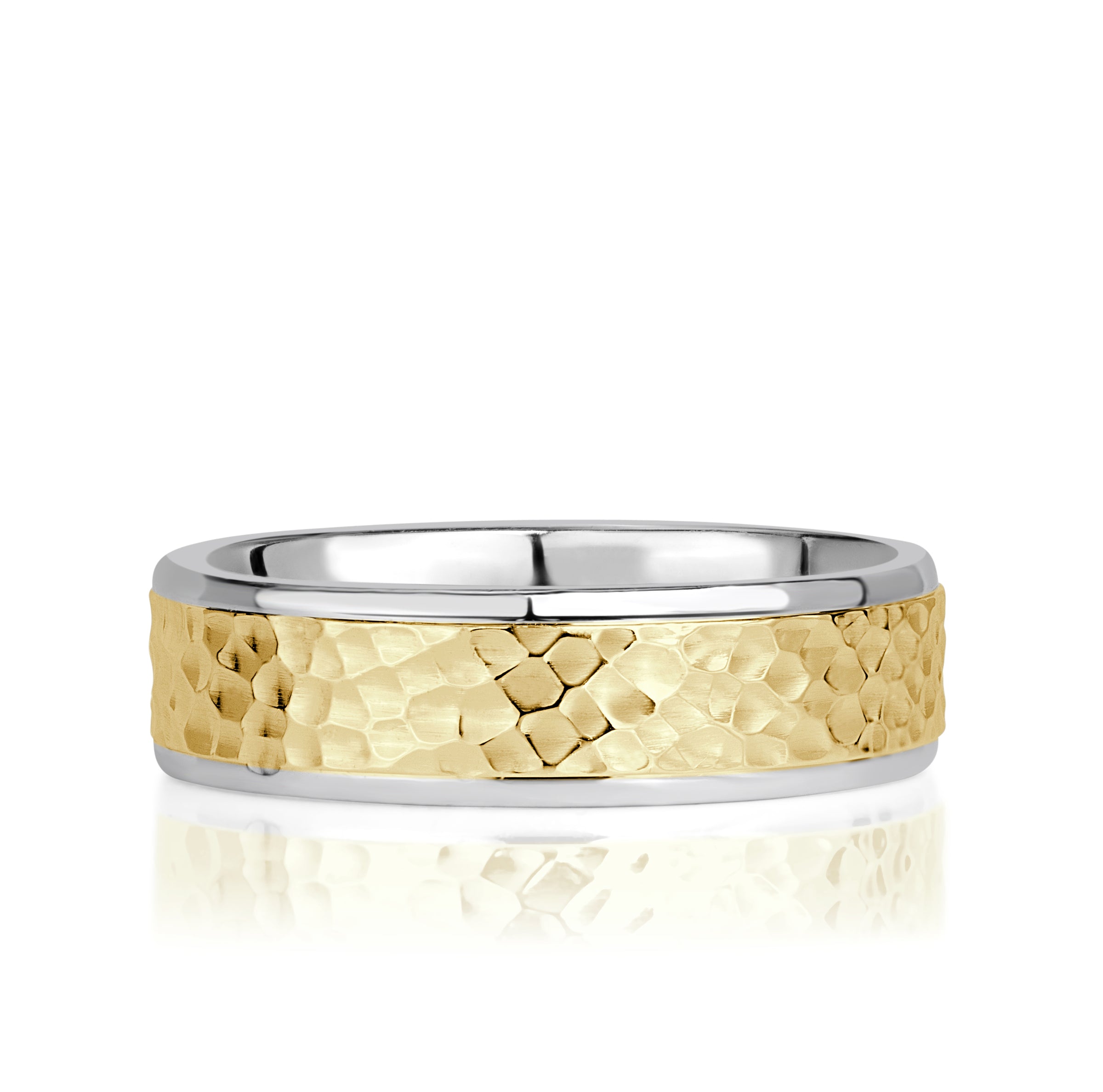 A study in contrast and craftsmanship, this 6.5 mm men’s wedding band blends bold texture with sleek geometry. The hammered center catches and scatters light across each facet, producing a natural play of brilliance, while the polished step edges frame the design with clean, architectural precision.