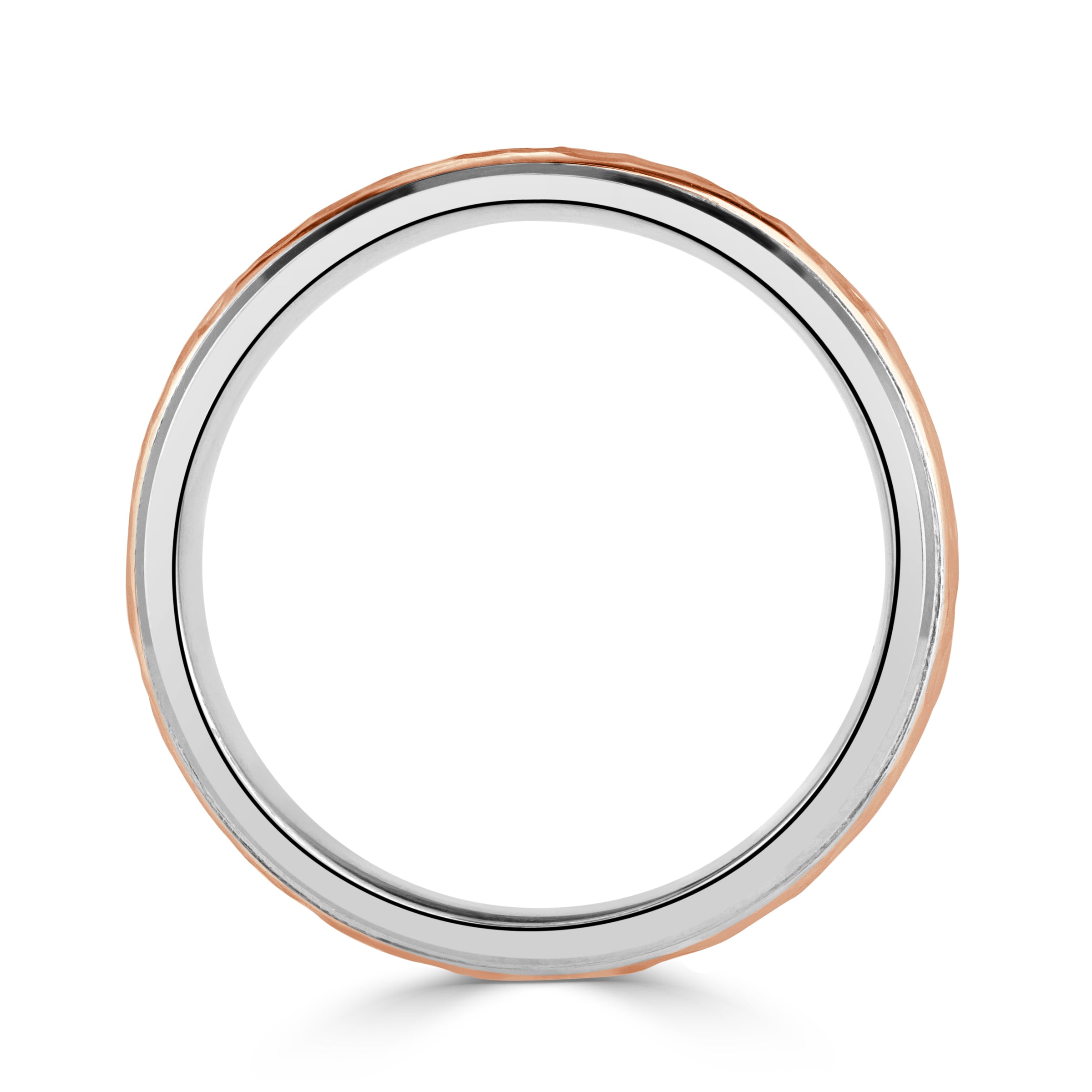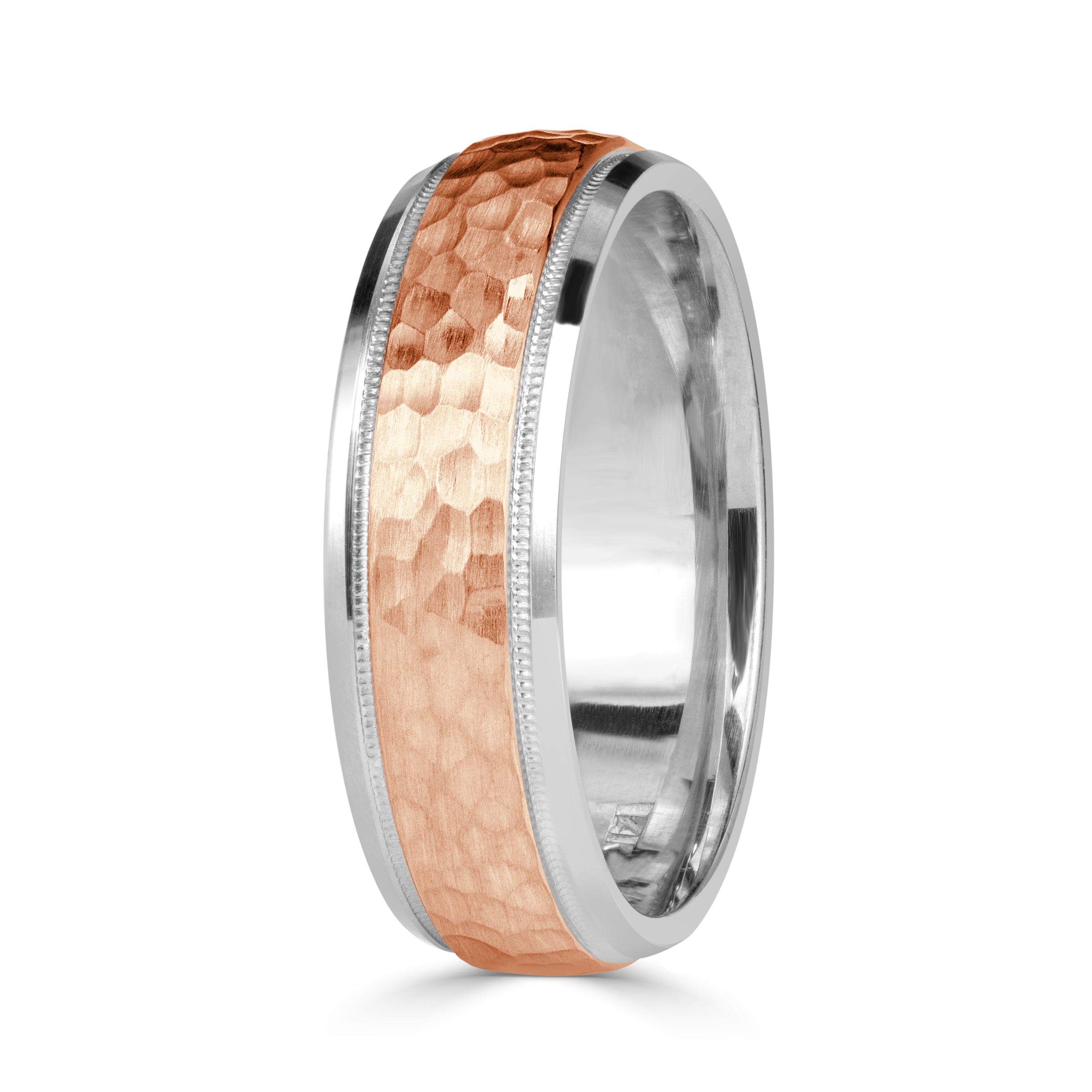 This men's wedding band is an excellent choice for men seeking a symbol of enduring commitment that balances tradition and contemporary style. The hammered texture symbolizes resilience and strength, while the milgrain detail highlights craftsmanship and attention to detail, distinguishing it from more conventional designs.