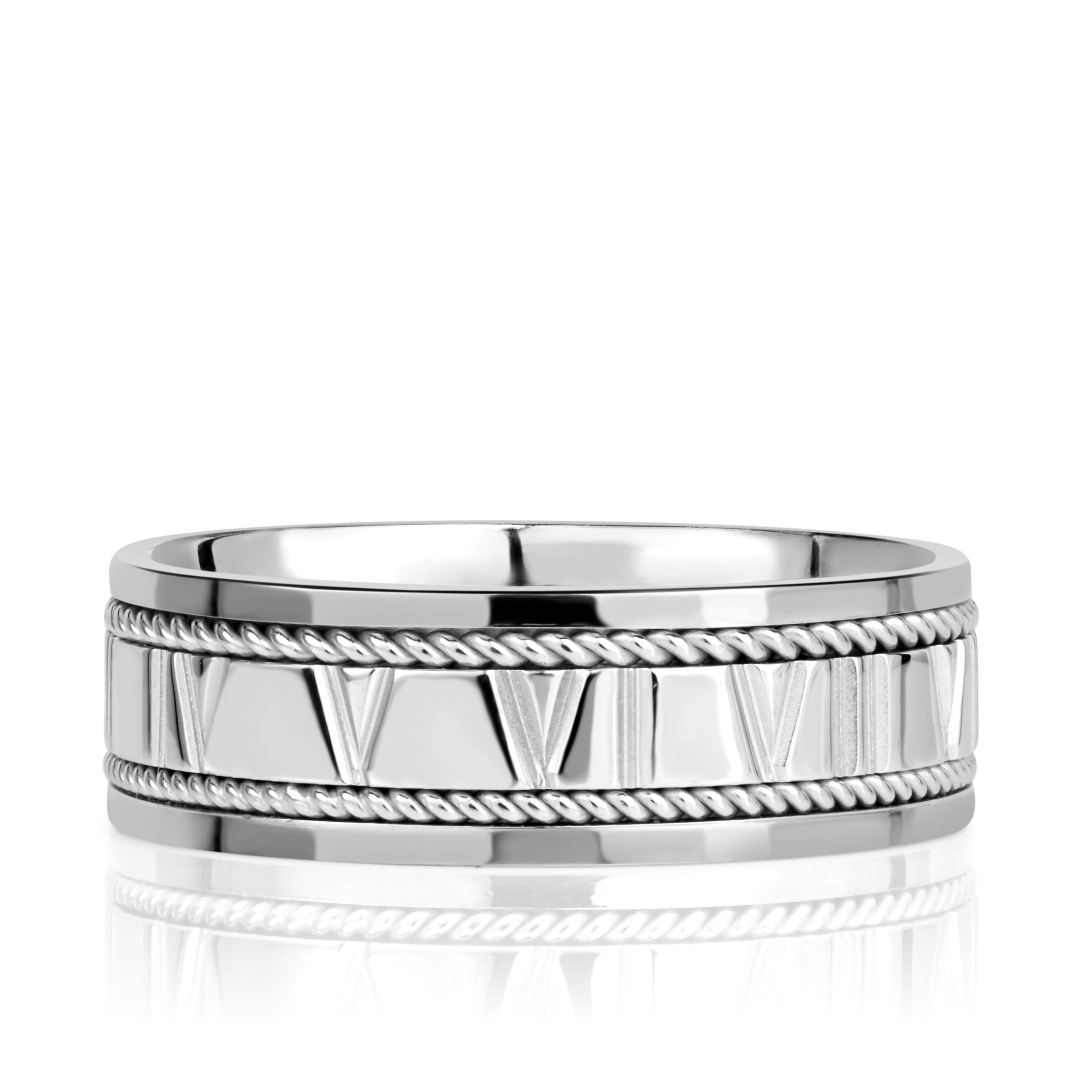 The Roman Numeral Rope Edge Men's Wedding Band embodies strength, heritage, and enduring style. The central design features hand-carved Roman numerals—a timeless symbol of permanence and devotion—rendered with precision. Each numeral catches the light, creating subtle movement across the surface.