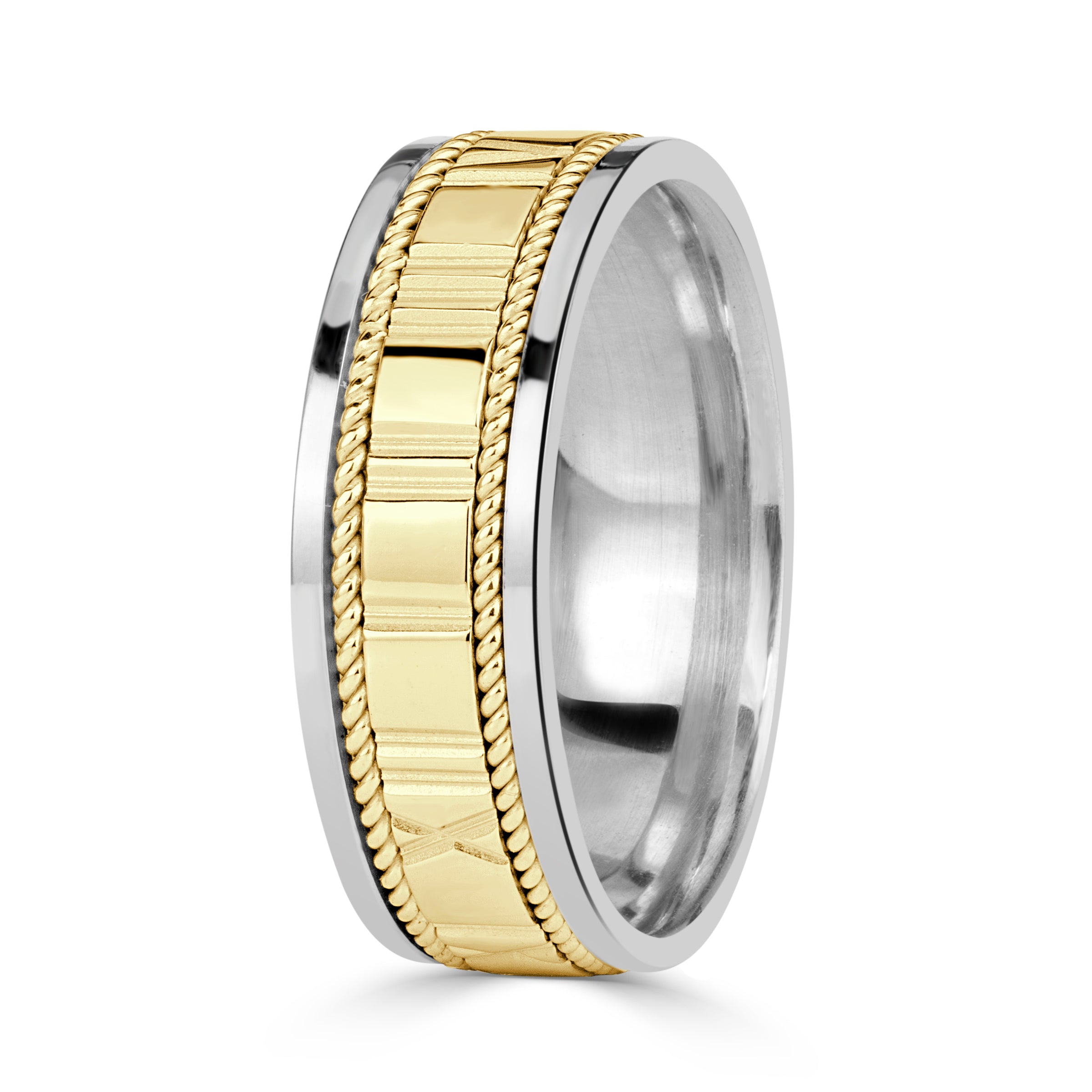 The Roman Numeral Rope Edge Men's Wedding Band embodies strength, heritage, and enduring style. The central design features hand-carved Roman numerals—a timeless symbol of permanence and devotion—rendered with precision. Each numeral catches the light, creating subtle movement across the surface.