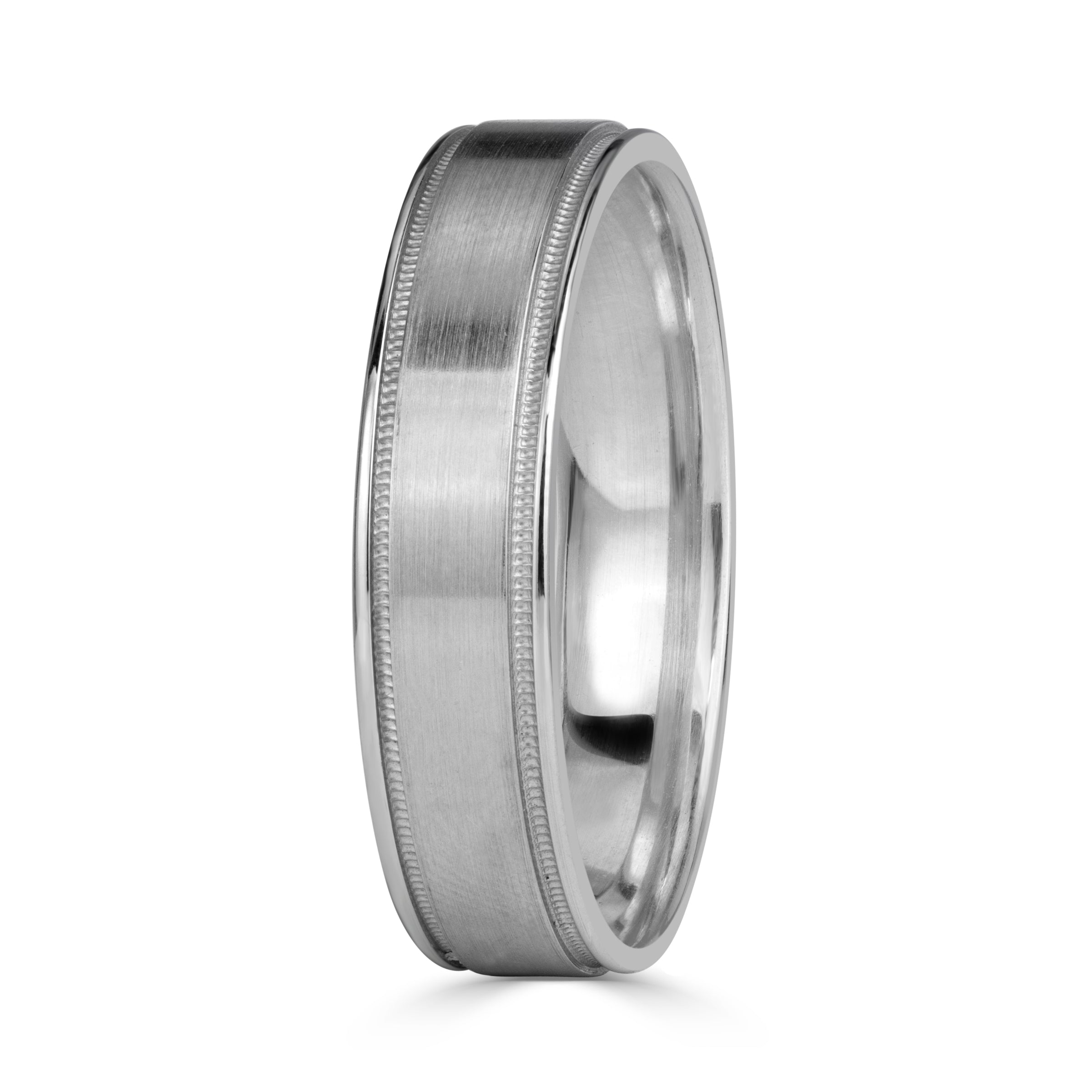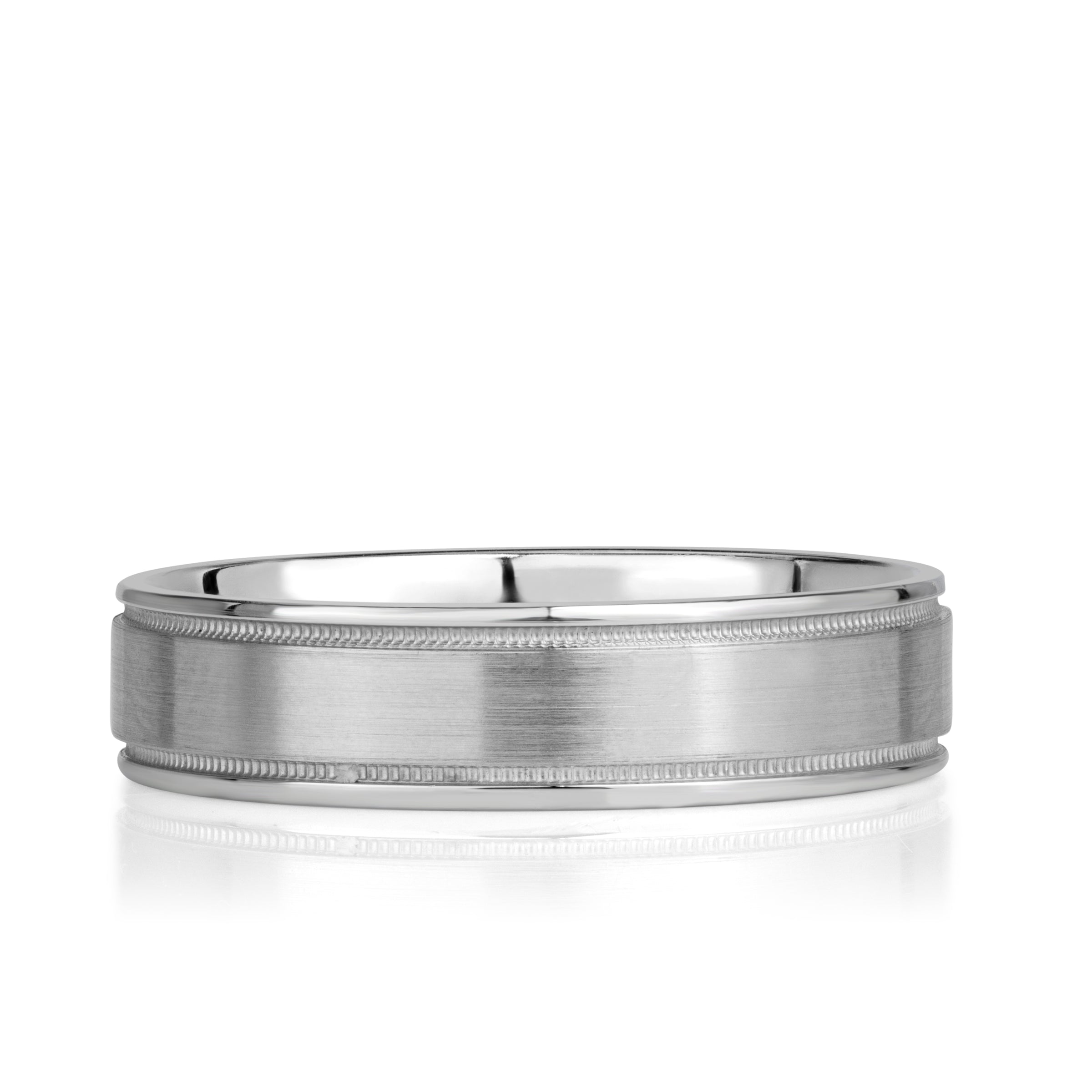 Timeless yet modern, this 6 mm men’s wedding band balances refined texture with architectural precision. The satin-finished center offers a subtle, matte glow, softening the reflection of light, while its borders are defined by hand-finished milgrain beading. Framing it all, crisp step edges create clean lines that emphasize the strength and geometry of the band.