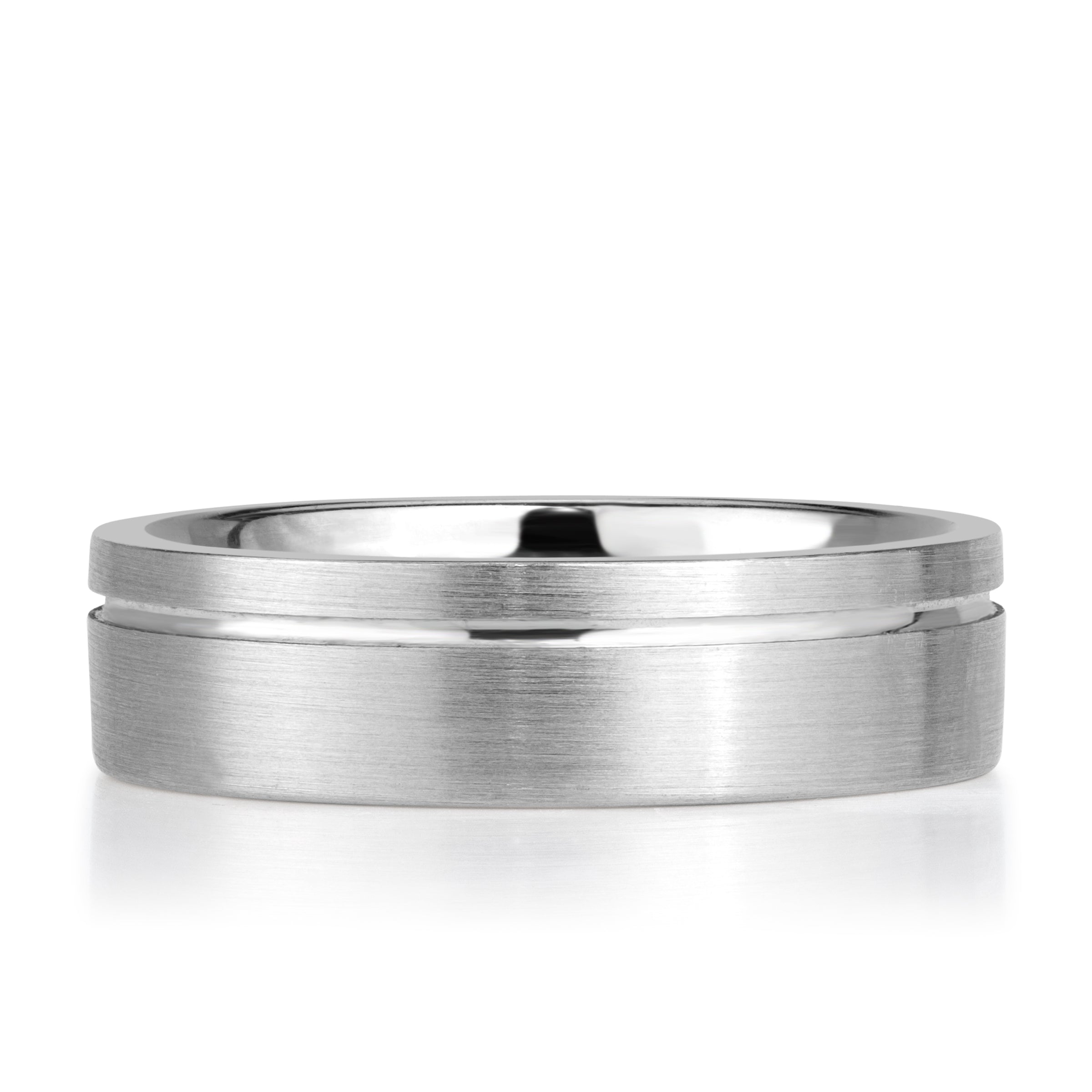 Quietly confident and impeccably proportioned, this Off-Centered Groove Satin Men's Wedding Band embodies modern restraint with architectural clarity. The softly brushed exterior diffuses light, creating a refined matte presence that feels deliberate rather than decorative. A single recessed off-centered groove encircles the band, introducing depth and definition while maintaining a clean, uninterrupted profile.