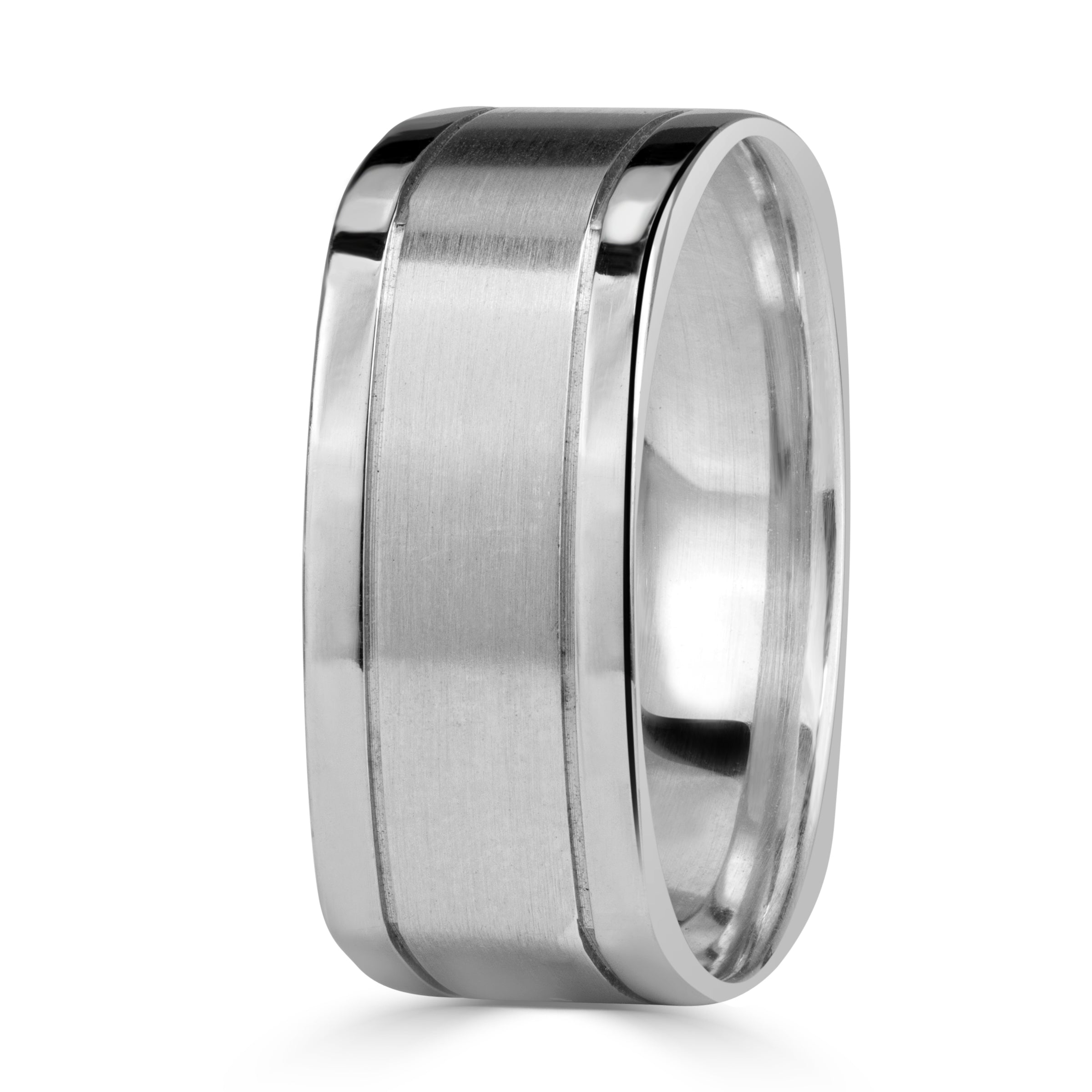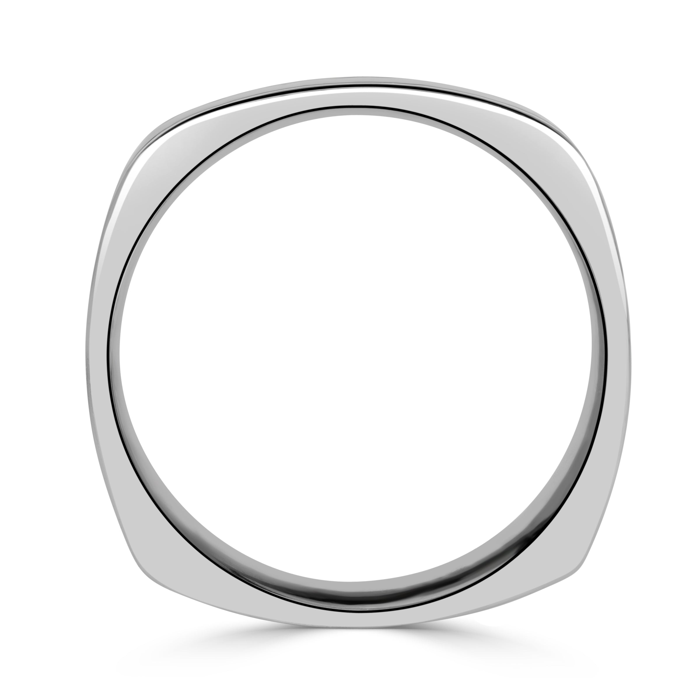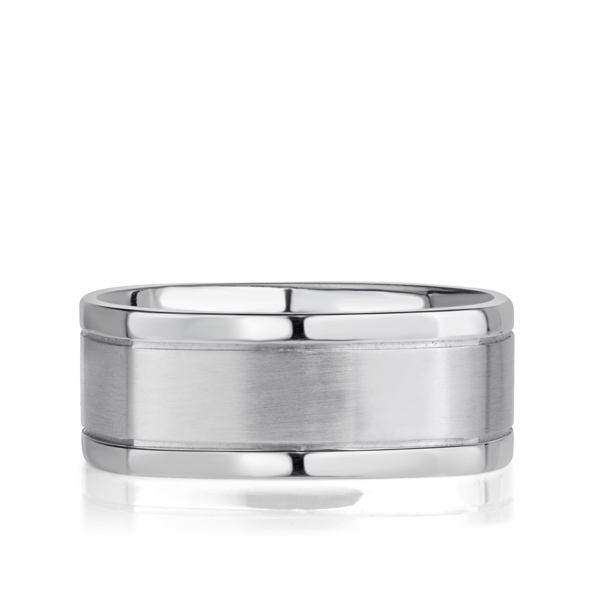 Defined by its bold geometry and elegant contrast, Satin Center Polished Edges Square Men's Wedding Band blends a softly textured satin-finished center with gleaming, high-polish edges. The juxtaposition of finishes emphasizes the band’s architectural lines: the satin centre absorbs light for a modern matte look, while the polished borders frame it in brilliance.