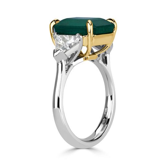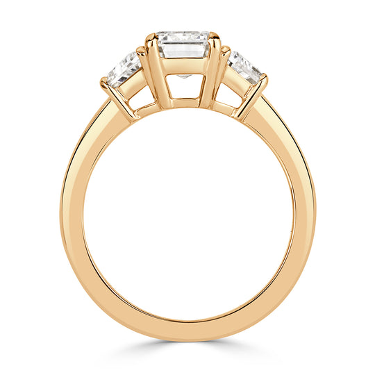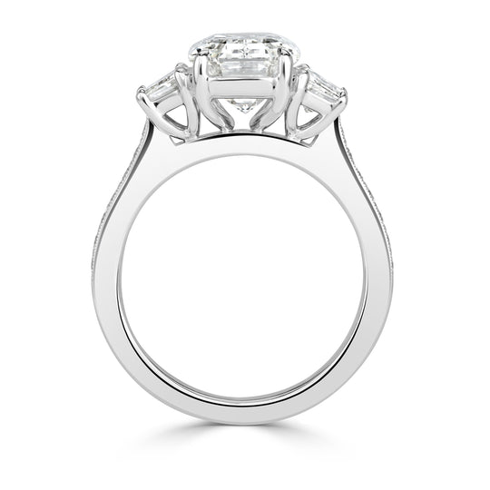 Three-stone settings, which incorporate two additional diamonds on either side of the center stone, symbolize the past, present, and future of your relationship. This design adds depth and dimension to the ring, with the side stones accentuating the center emerald-cut diamond. You can select matching diamonds for a cohesive look or incorporate colored gemstones for a unique, personalized touch.