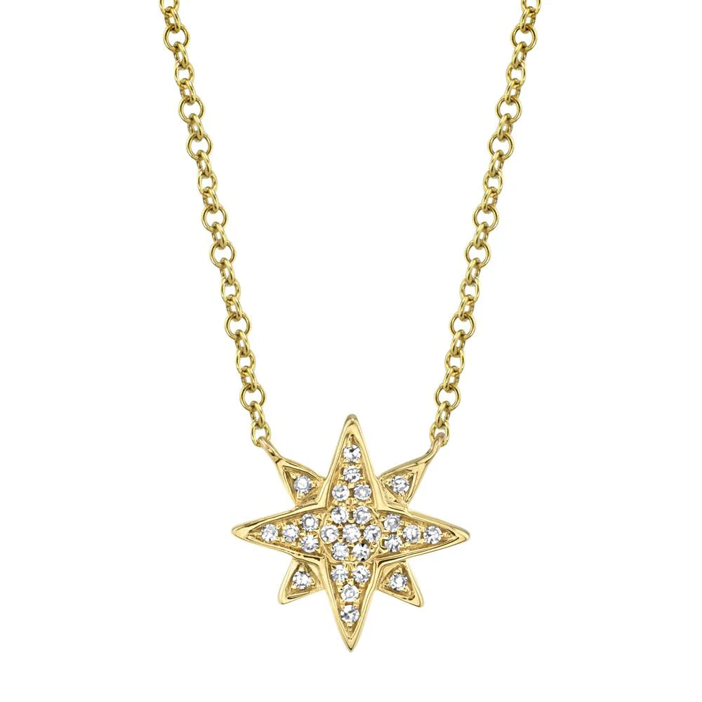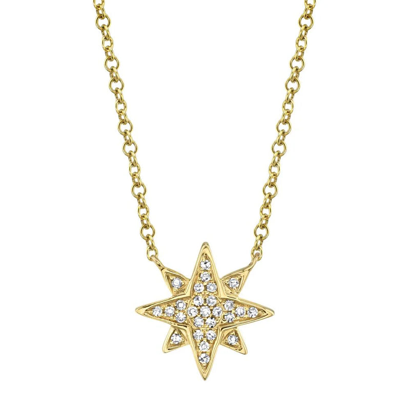This stunning 0.06ct diamond North Star pendant in 14k gold features round brilliant micro pavé diamonds lining an elegant eight-pointed star, creating a dazzling effect. Crafted in sleek gold, this celestial design makes for a refined and sophisticated look and serves as a timeless accessory for any occasion.