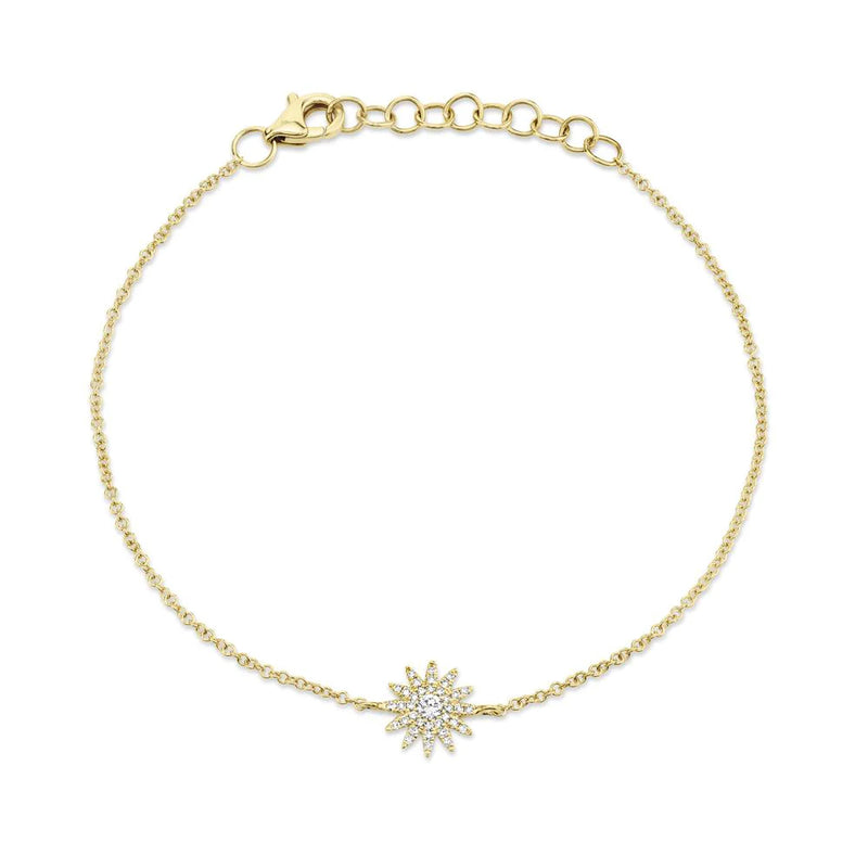 Presenting our celestial-inspired wonder. This 14k gold bracelet features a delicate starburst motif adorned with sparkling round brilliant cut diamonds totaling 0.14 carats. Crafted to perfection, each diamond glimmers against the gold, evoking the beauty of the night sky. This bracelet is a symbol of individuality, perfect for adding a touch of unmatched charm to any ensemble.