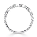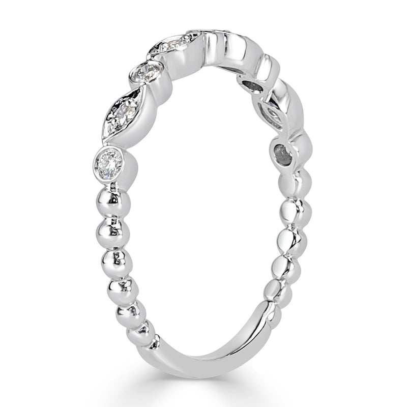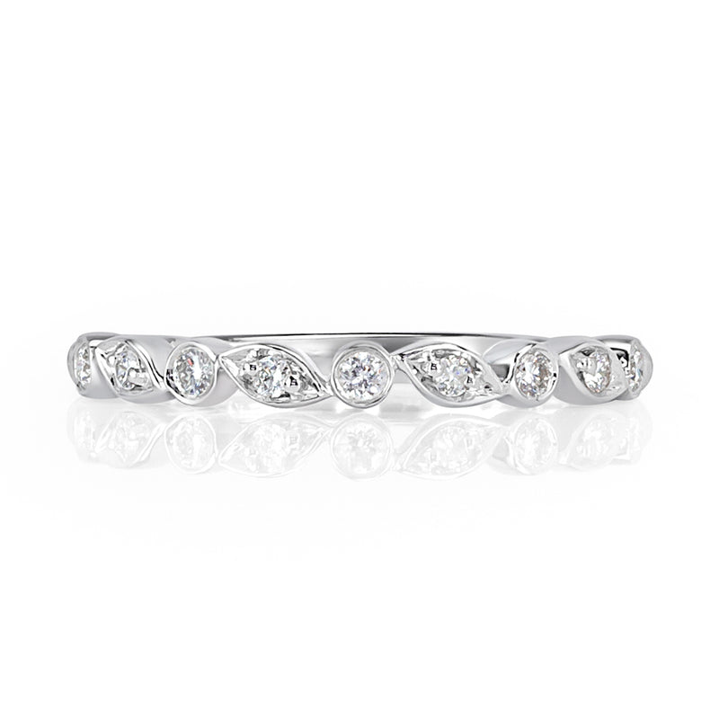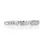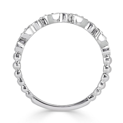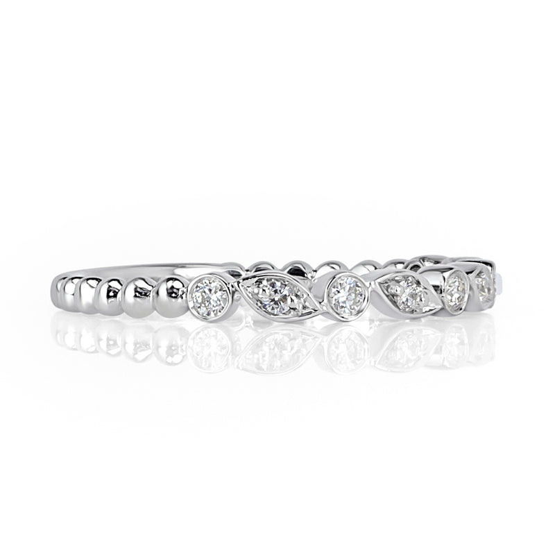 Vintage style and brilliant white diamonds, this ring has it all. Sparkling high quality round brilliant cut diamonds glitter in this lovely wedding band. Individually bezel set in an alternating round and marquise pattern this ring is stunning from all angles. Complete with beaded detailing on the band and expertly created in high polish platinum. This ring looks splendid by itself or worn in stack.