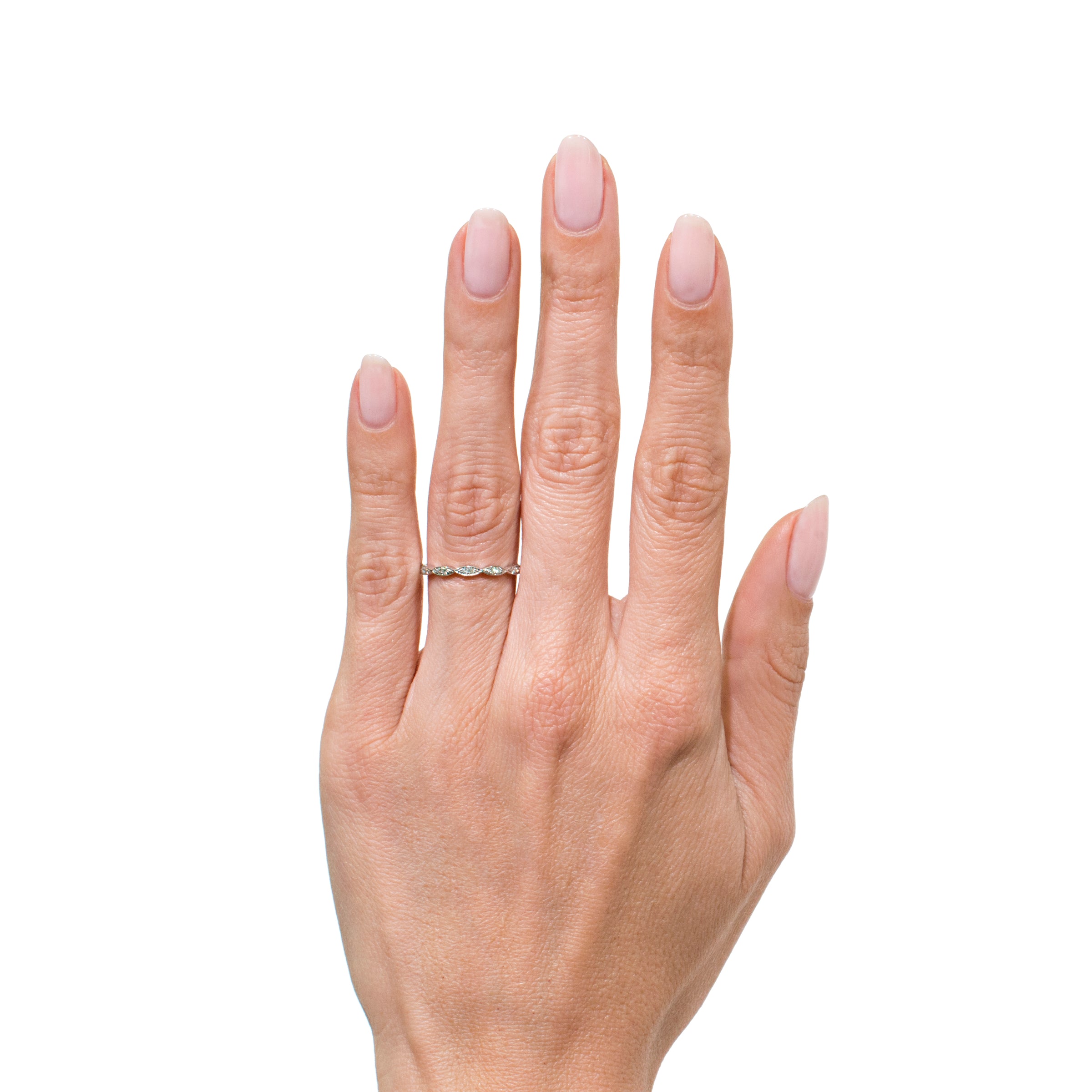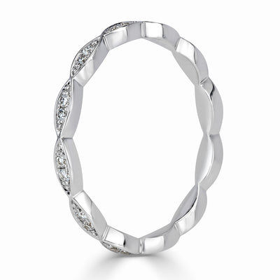 Premium white round brilliant cut diamonds are embedded into this sleek intertwining marquise band design. Expertly created in high polish 18k white gold this band is feminine and elegant. The stunning band sits perfectly flush against other pieces or lovely styled alone as well.