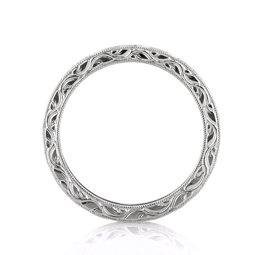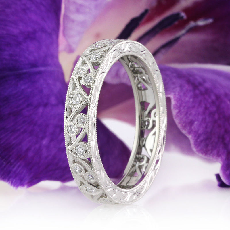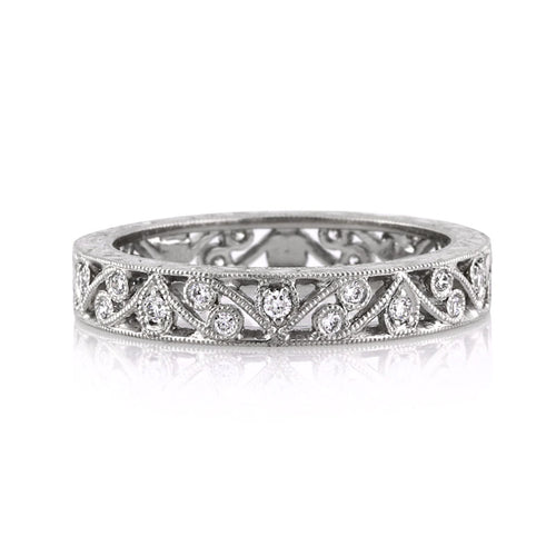 This gorgeous custom-made platinum diamond eternity band features a lovely eternity filigree design. It is hand detailed with small beading or milgrain throughout. There are 0.35ct of round diamonds accents flush set all the way around. This wedding band design can be custom created in white, yellow or rose gold.
