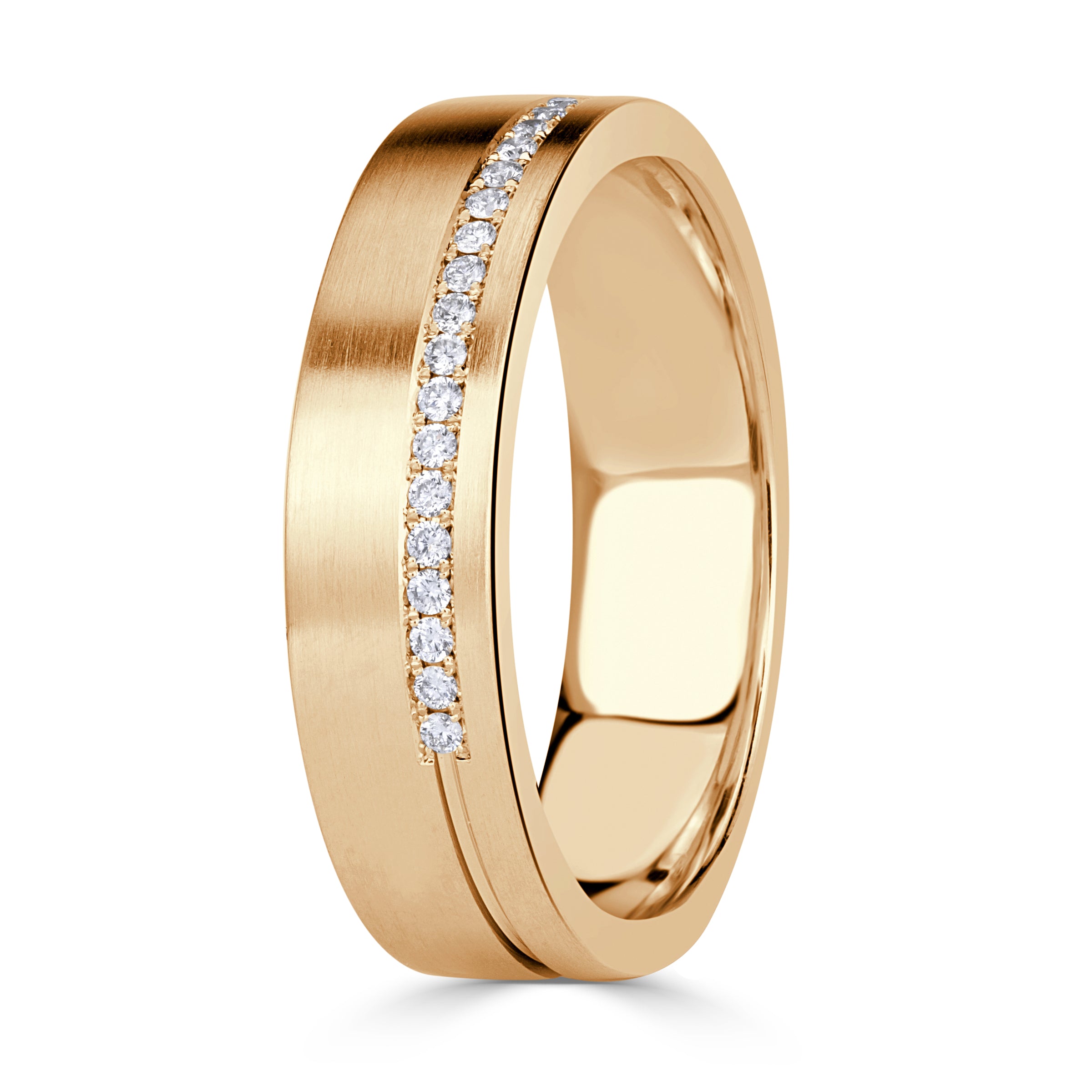 The design incorporates a comfort-fit interior, allowing the men's diamond wedding band to sit smoothly on the finger for extended wear without irritation. Available in a satin finish, the men's diamond wedding band’s aesthetic versatility complements both classic and modern wardrobes. Ethical sourcing of diamonds and metals ensures that each ring meets the highest standards of responsible luxury.
