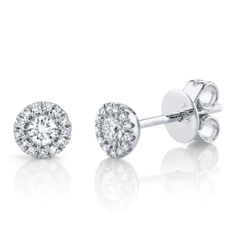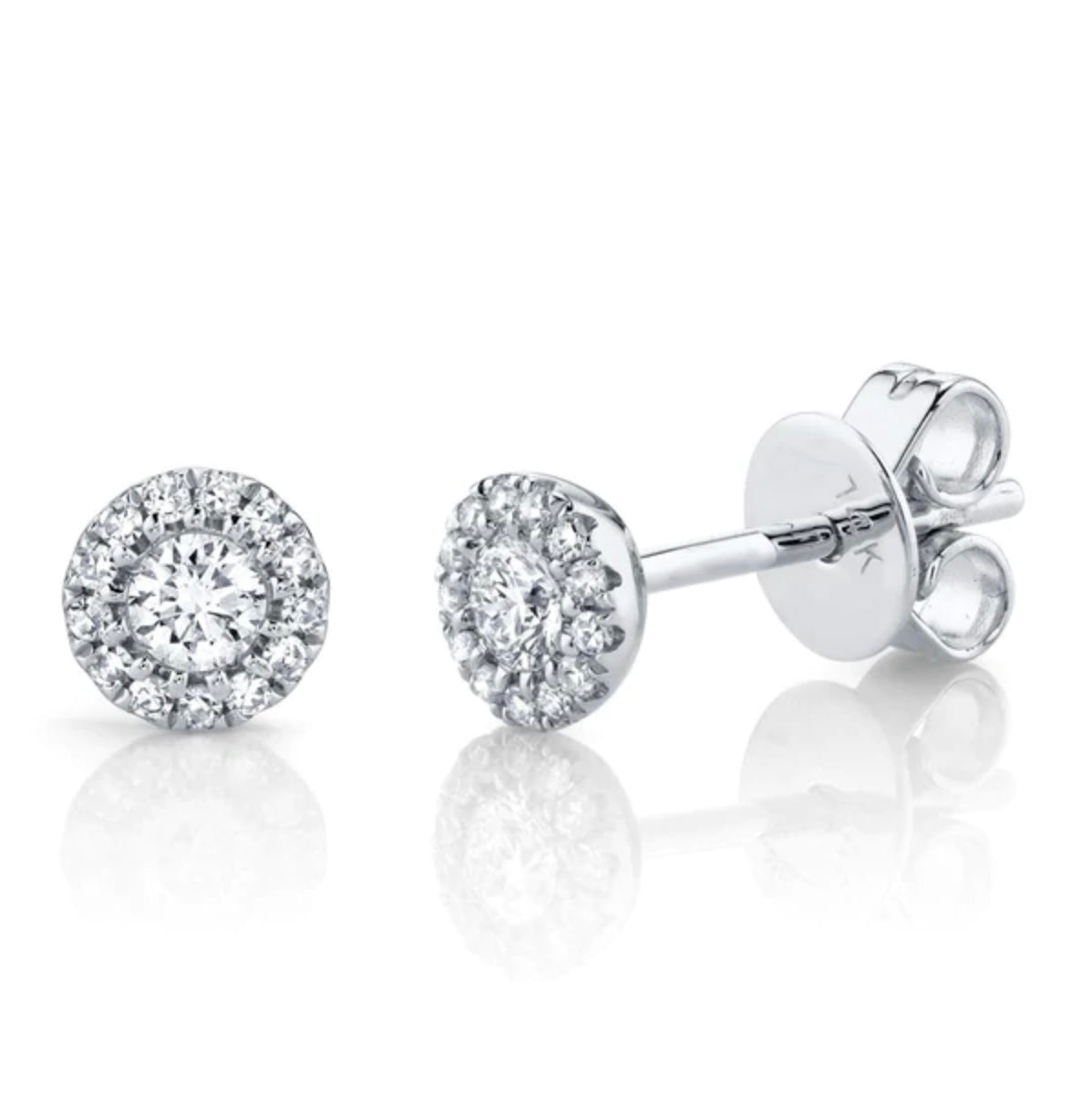 These elegant 0.24ct round brilliant cut diamond stud earrings are a timeless classic. Two larger round brilliant cut diamonds are set in the center of this 14k gold halo setting. These simple earrings are a great alternative to traditional solitaire studs, they are perfect for everyday wear.