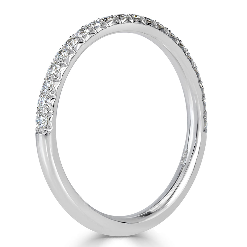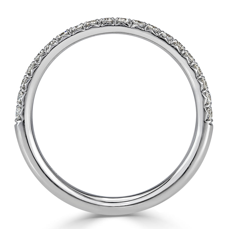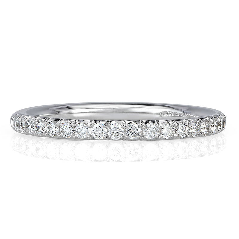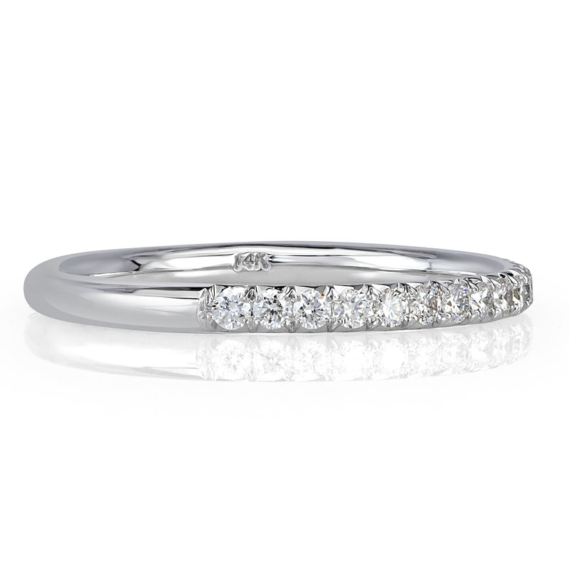Glimmering round brilliant cut diamonds are finely handset into a dainty and meticulous 18k white gold french micropave setting. The diamonds are certified at premium white color gradings of E-F and perfectly eyeclean clarity gradings of VS1-VS2. This classic diamond band is beautiful stacked with other rings or as a stand alone piece!