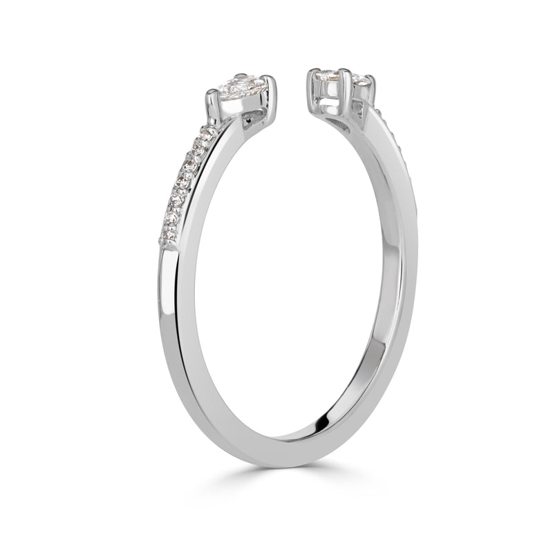 Meet your new favorite stacking band! Our 0.20ct Pear Shape and Round Brilliant Cut Diamond Open Band gracefully wraps your finger, adorned with pear-cut and round diamonds that dance in the light. Meticulously designed, this unique open band exudes modern sophistication, symbolizing the journey you're embarking upon. A radiant reflection of your style and commitment, this ring is truly exceptional. Shown in 18k  white gold.