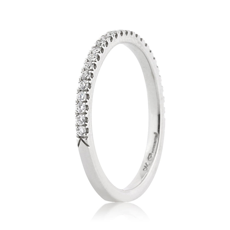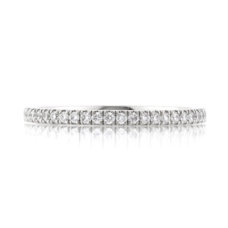 This dainty round brilliant cut diamond micropave wedding band is very finely crafted and is perfect as a stand alone band or paired with your engagement ring. It is set with 0.30ct of bright, white round diamonds on a narrow platinum setting.