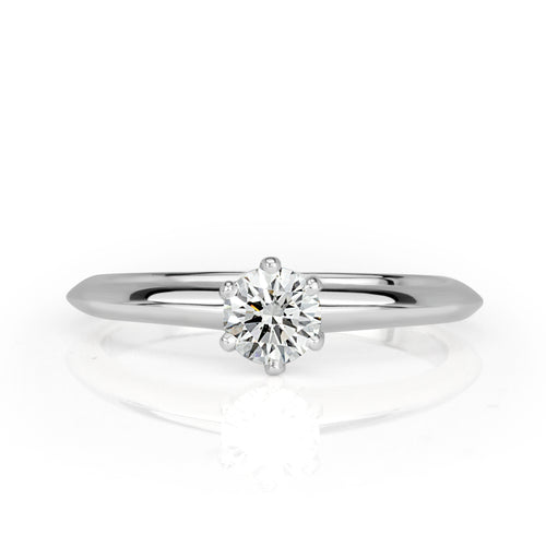 Elegant design and lasting beauty are apparent in this classic solitaire diamond engagement ring. The beautiful 0.32ct round brilliant cut center diamond is certified at F-VS1, exceptionally white with very high clarity. The phenomenal cut on this centerpiece affords the diamond an extremely fiery sparkle. It is set in a luxurious six-prong platinum setting from Tiffany and Co. Be amazed with this timeless round brilliant cut diamond ring.