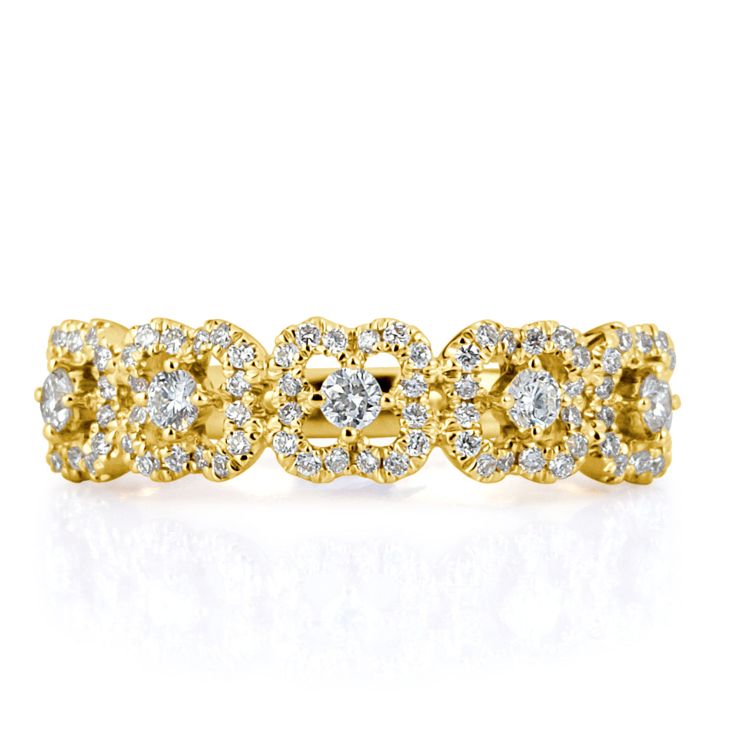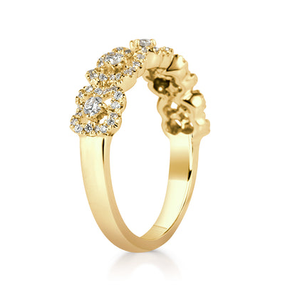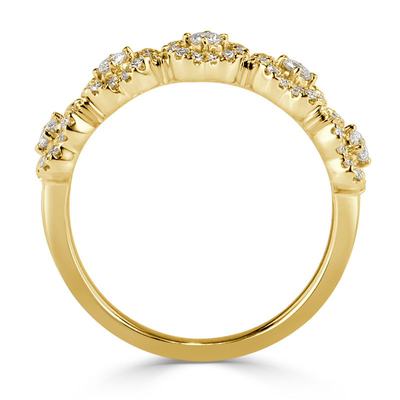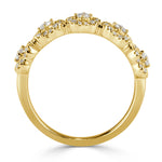 The design of this diamond and 14k yellow ring gives it a delicate, feminine appearance. The pretty floral pattern repeats halfway around the ring for a sparkly look and comfortable wear.