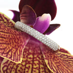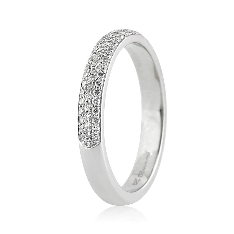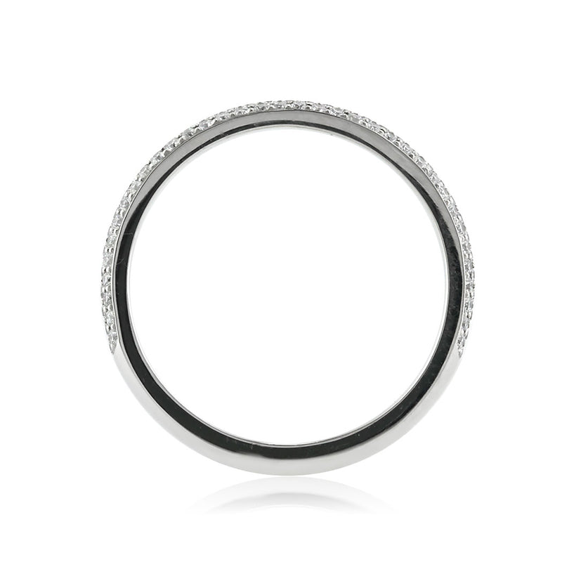 Three rows of pavé round brilliant cut diamonds of superior quality affords this wedding band phenomenal brilliance. The white diamonds are set just past half way, and it has a relatively low profile allowing for maximum comfort. It is perfect worn solo or paired with an engagement ring.